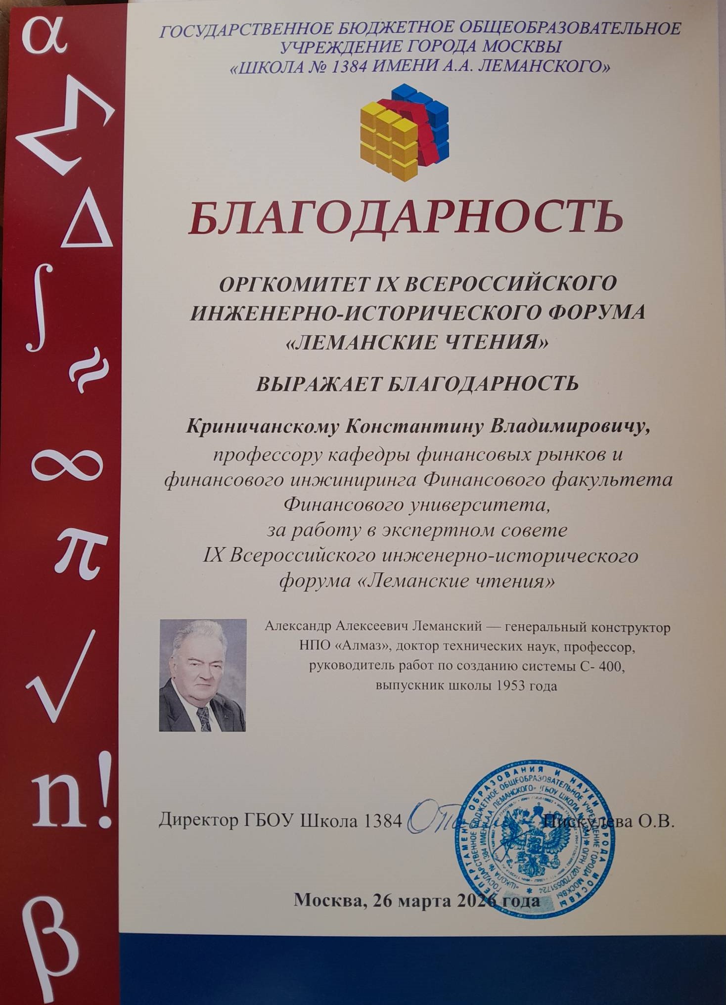 26 марта 2026 года на базе ГБОУ Школа № 1384 был проведен Инженерно-исторический форум «Леманские чтения». Это мероприятие, стартовавшее девять лет назад, направлено на поддержку технологического образования, развитие у школьников навыков интеллектуально-творческой и исследовательской деятельности.