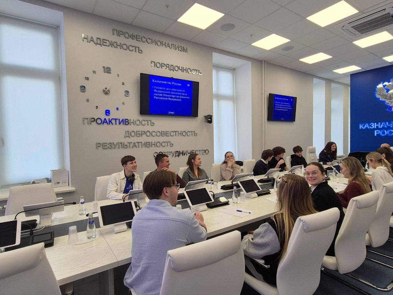 В завершение визита для студентов была проведена экскурсия по зданию Казначейства и интеллектуальная викторина. Встреча продолжилась дискуссией, где студенты смогли задать вопросы действующим специалистам.