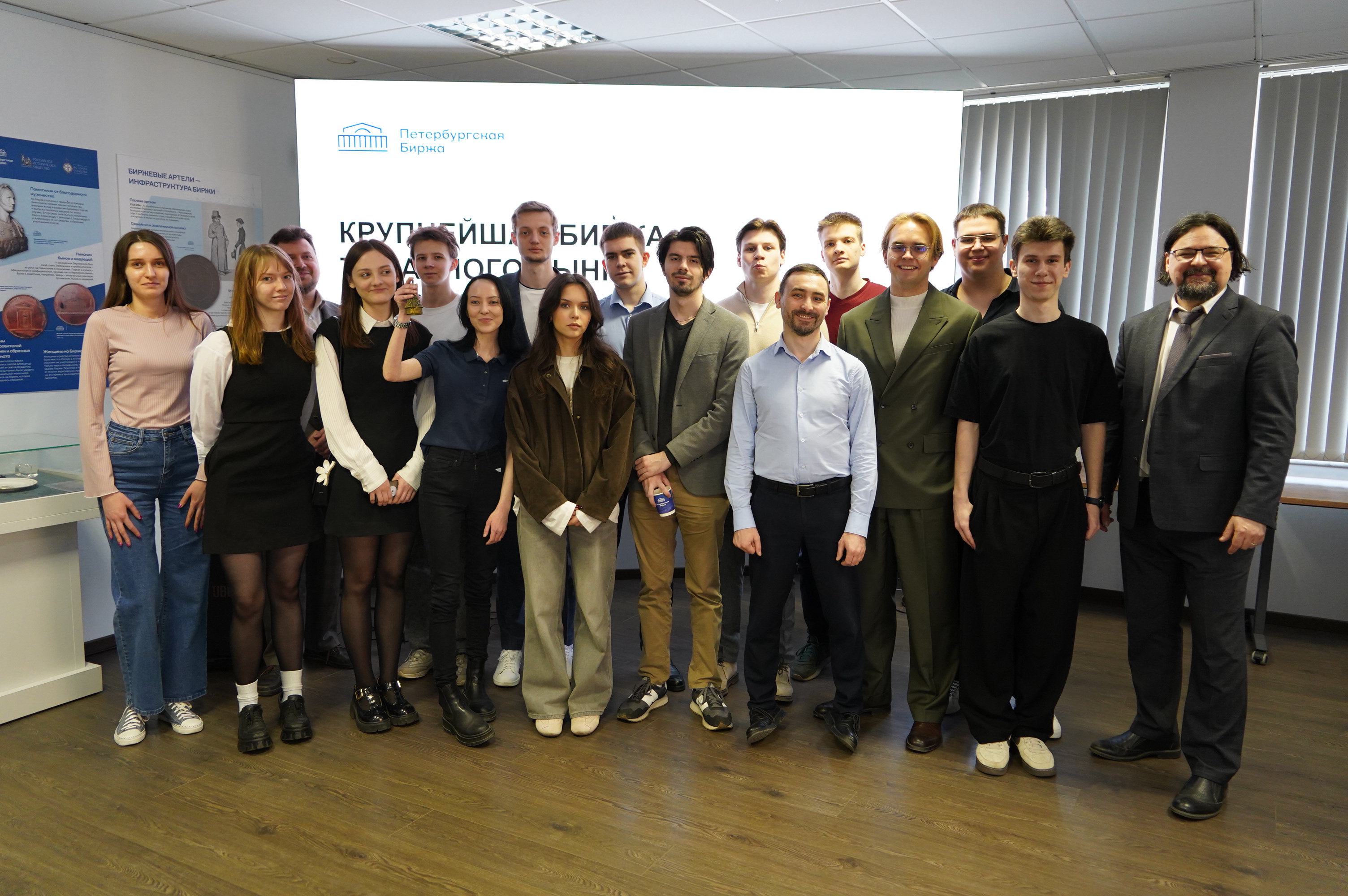 В ходе визита студенты узнали, что Петербургская Биржа является крупнейшей товарной биржей России и входит в число крупнейших спотовых бирж мира. Сегодня биржа объединяет 7 755 участников торгов и их клиентов, предлагает более 7 300 инструментов товарного и срочного рынков и обеспечивает 99% объемов биржевого товарного рынка России.
