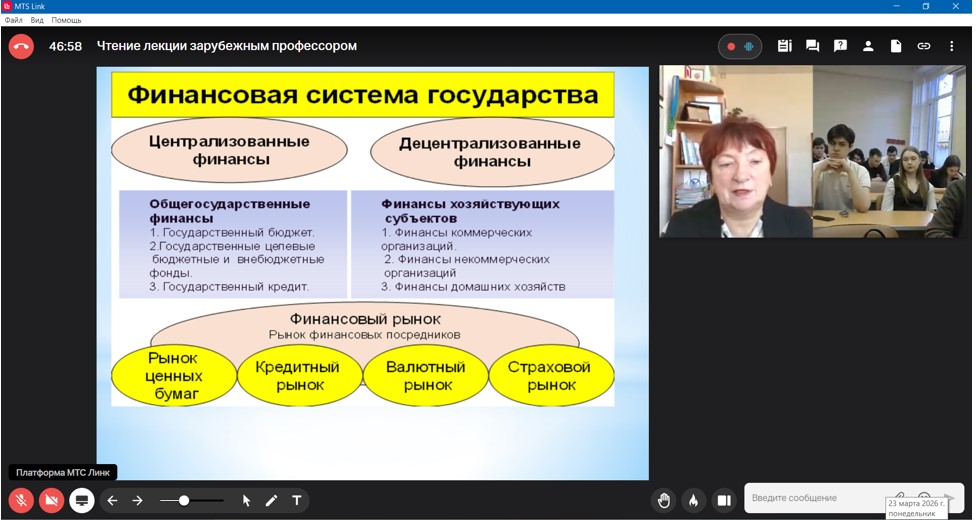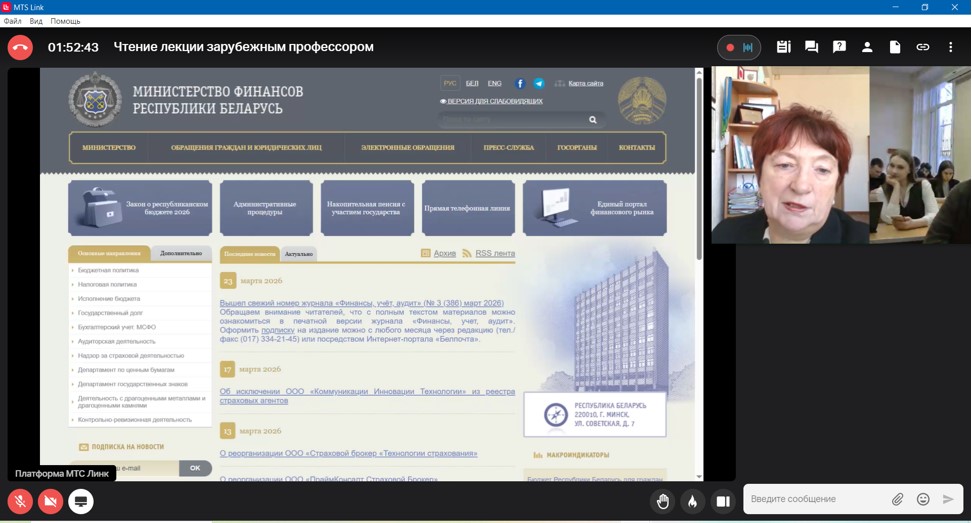 23 марта 2026 года по приглашению Кафедры общественных финансов Финансового факультета в рамках реализации программы «Приглашенный профессор» состоялась открытая лекция, которую провела доктор экономических наук, профессор, заведующий кафедрой финансов Белорусского государственного экономического университета Верезубова Татьяна Анатольевна.