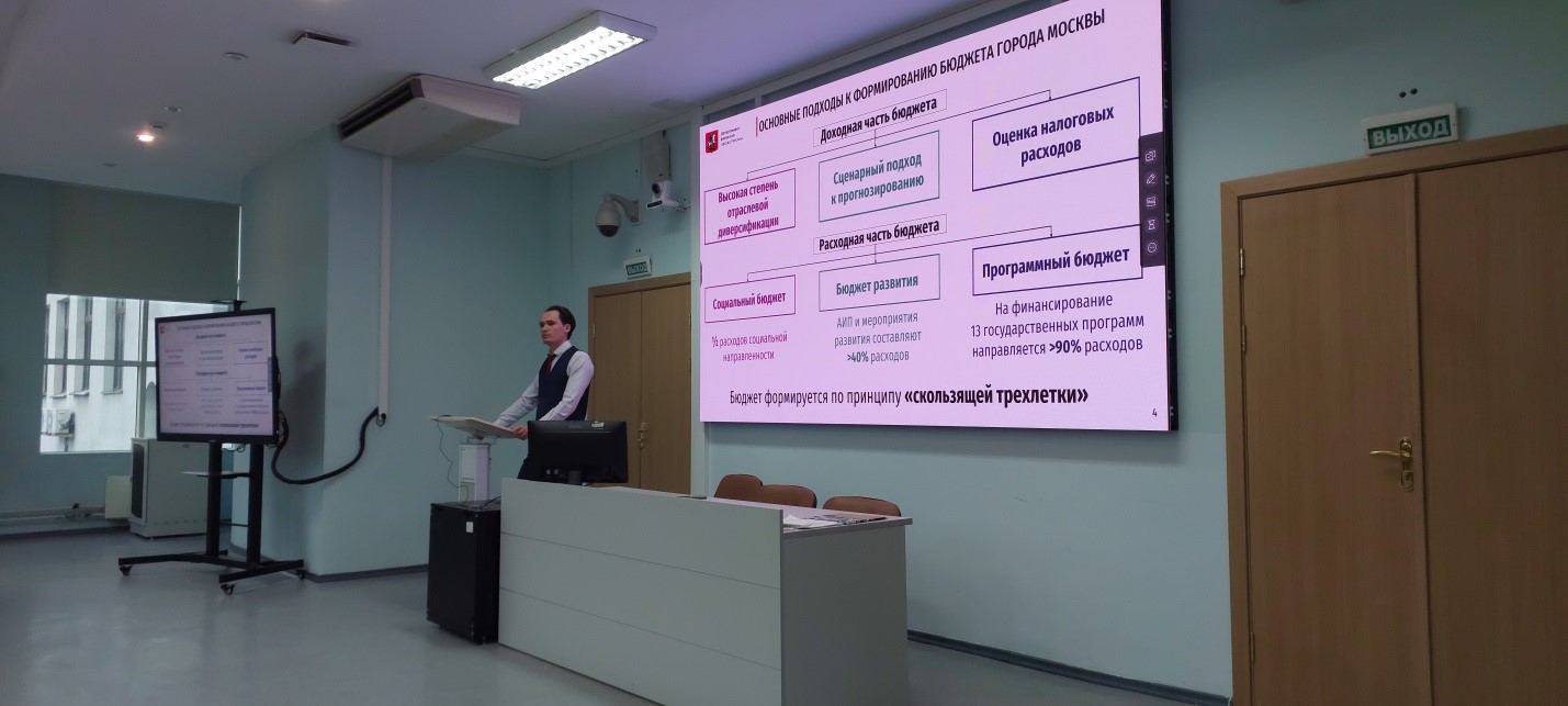 В ходе лекции были рассмотрены особенности бюджетного устройства города Москвы, подходы к формированию бюджета города Москвы и основные направления бюджетной политики на 2026–2028 годы, включающие обеспечение устойчивости и стабильности бюджетной системы, совершенствование межбюджетных отношений, обеспечение социальной защиты москвичей, повышение качества и доступности оказания услуг населению, реализацию масштабных планов по развитию городской инфраструктуры, поддержку реального сектора экономики, формирование комфортной и безопасной городской среды и др.