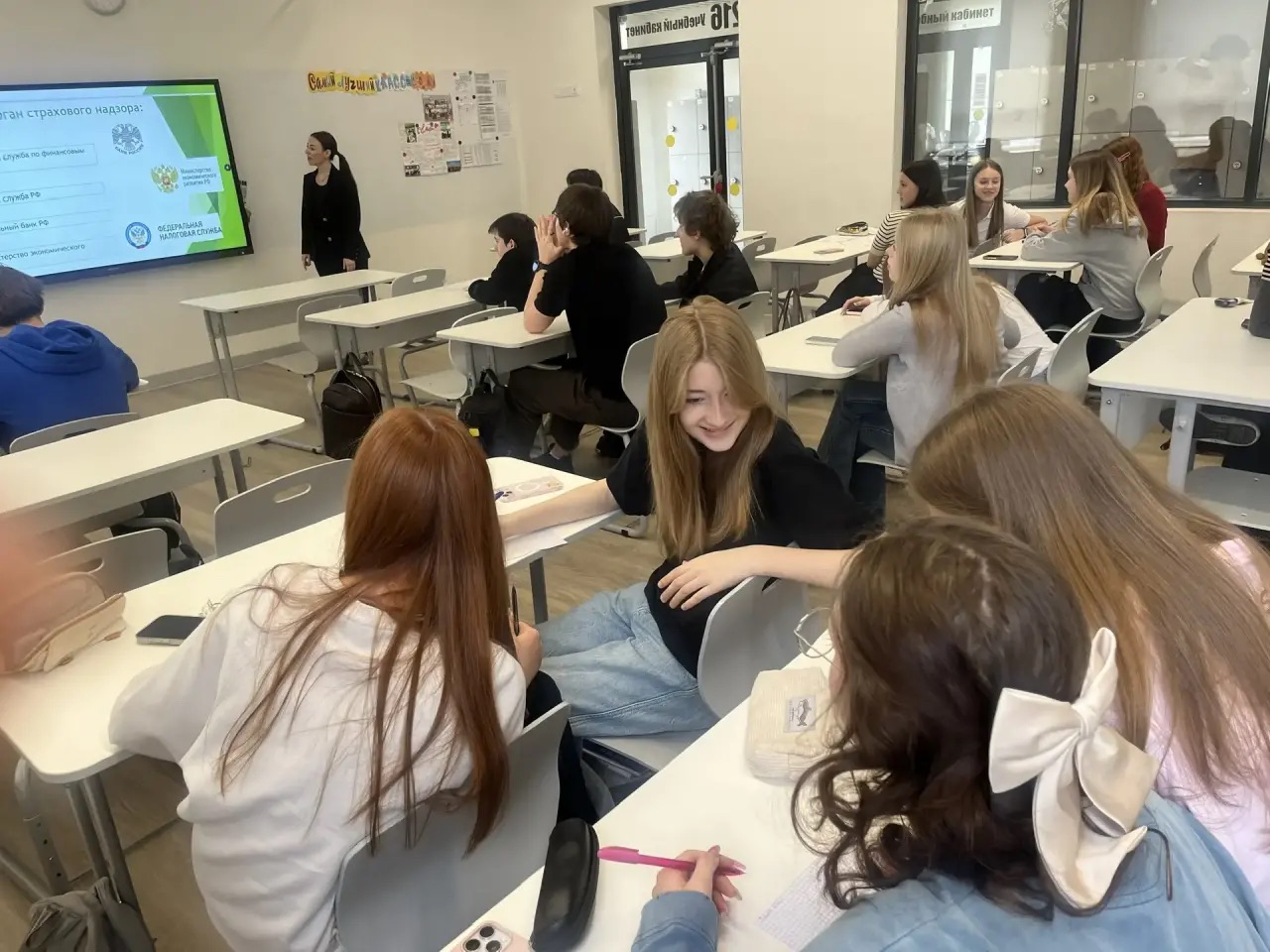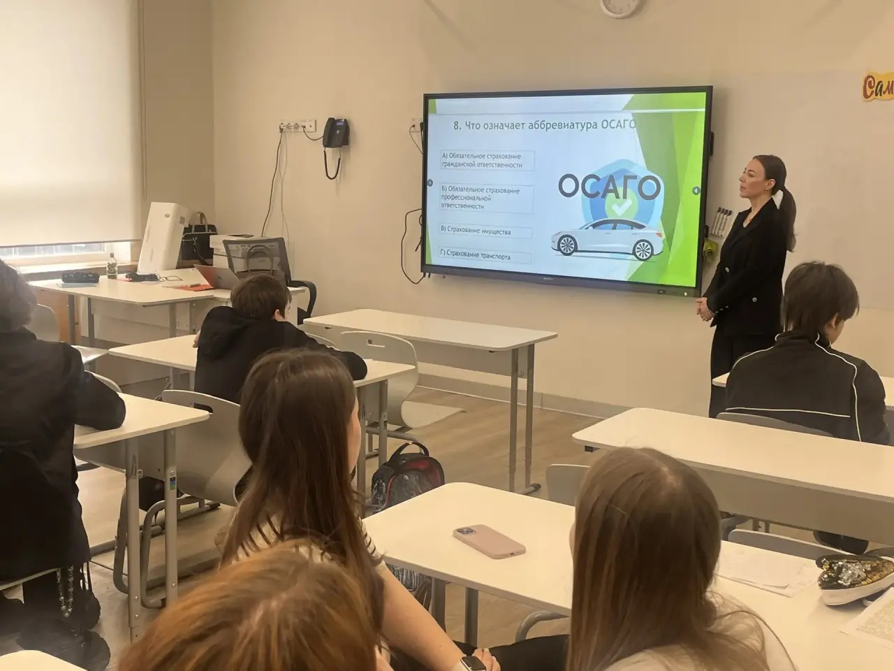 Во второй части занятия состоялась тематическая викторина по страхованию. Старшеклассники активно отвечали на вопросы, демонстрируя полученные знания, смекалку и искренний интерес к теме. Лучшие группы участников были отмечены преподавателем.