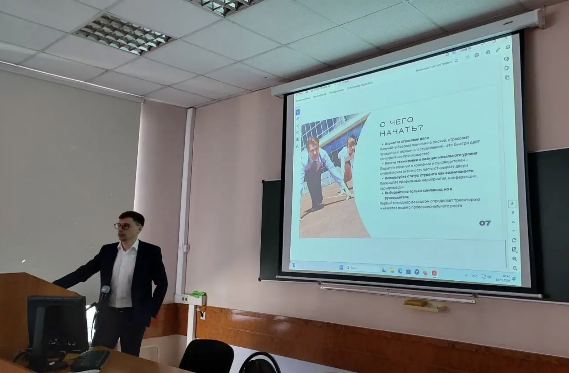 Для студентов 2 курса Финансового факультета 30 марта 2026 г. была организована профориентационная встреча, на которой Пирогова Татьяна Викторовна, заместитель заведующего Кафедрой страхования и экономики социальной сферы по методической работе и связям с работодателями рассказала о многолетней тесной работе с профессиональным сообществом и о том, как кафедра на протяжении 35 лет готовит специалистов для страхового бизнеса.