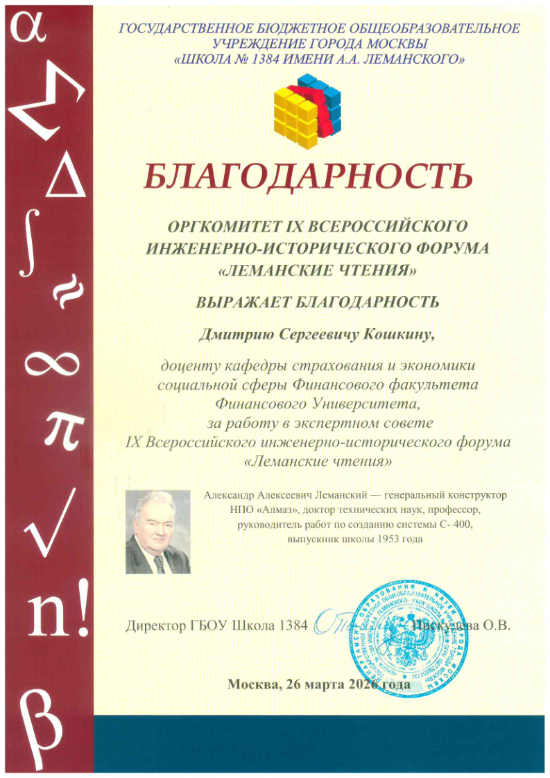 Доцент кафедры страхования и экономики социальной сферы, к.и.н. Д.С. Кошкин принял участие в экспертном совете секции по предпринимательству IX Форума «Леманские чтения», за что отмечен Благодарностью оргкомитета.