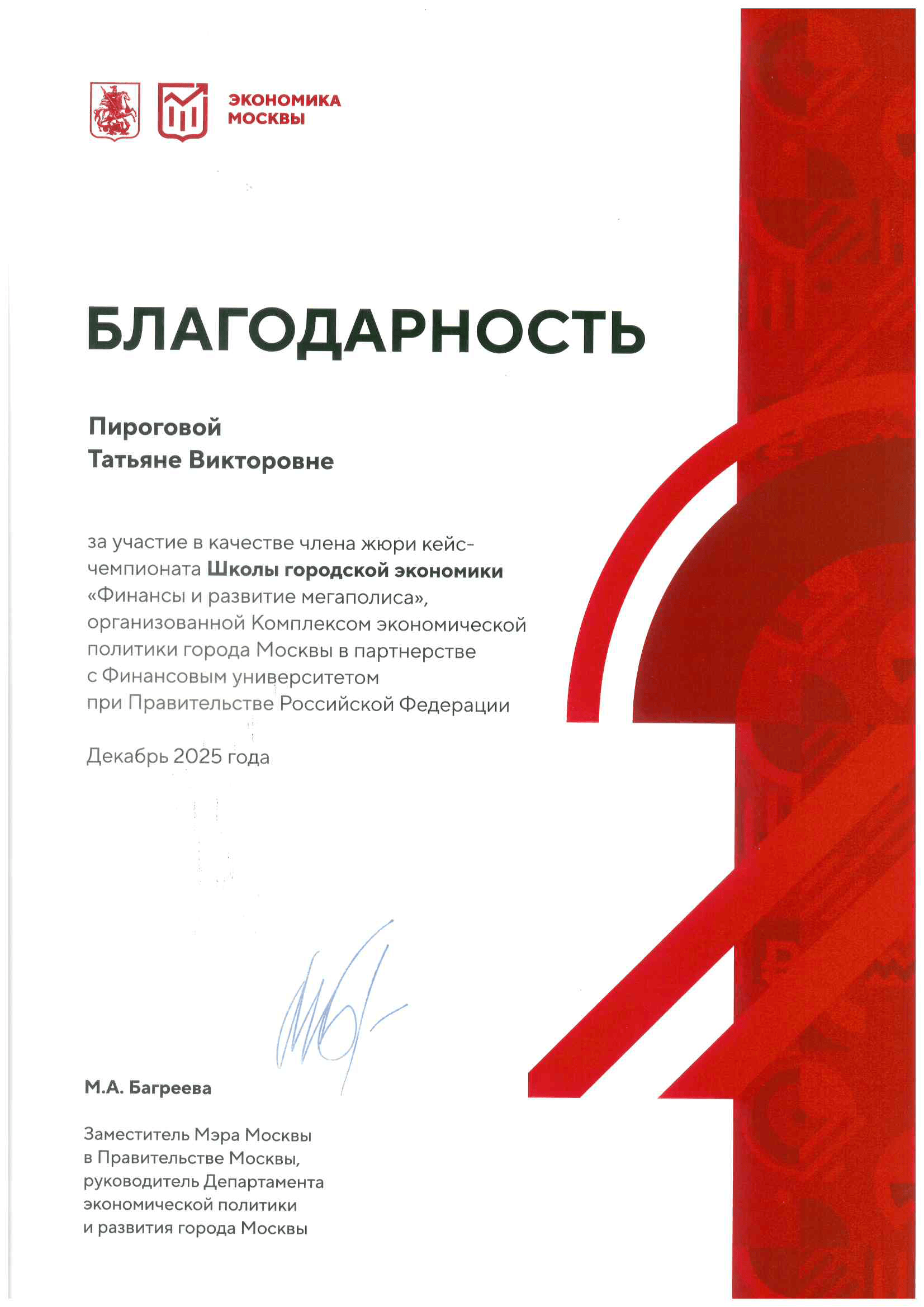 Заместитель заведующего Кафедрой страхования и экономики социальной сферы, к.э.н., доцент Т.В. Пирогова отмечена Благодарностью за участие в жюри кейс-чемпионата Школы городской экономики «Финансы и развитие мегаполиса». Мероприятие было организовано Комплексом экономической политики города Москвы (включая Департамент экономической политики и развития города Москвы) в партнерстве с Финансовым университетом. В Школе приняли участие студенты разных факультетов Финансового университета и более 10 вузов Москвы — НИУ ВШЭ, МГУ, РАНХиГС и др. Образовательный проект был посвящен ключевым вопросам развития и финансирования мегаполиса. В рамках кейс-соревнования участникам предстояло решить реальную задачу финансирования развития города. В командном формате студенты составили бюджет города, корректируя его с учетом кризисов и открывающихся возможностей. Также были рассмотрены задачи развития города до 2040 г.