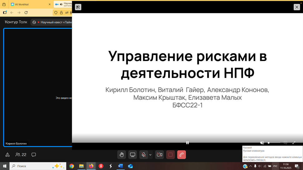 Студенты Финансового факультета Малинкина Юлия и Горбатенко Николай выступили с докладом «Страхование в Стратегии развития финансового рынка Российской Федерации до 2030 года». Доклад на тему «Управление рисками в негосударственных пенсионных фондах» подготовили Болотов Кирилл, Малых Елизавета, Гайер Виталий, Кононов Александр, Крыштак Максим. Профессорско-преподавательский состав отметил высокий уровень проработки заявленных тем и квалифицированные ответы на заданные вопросы.