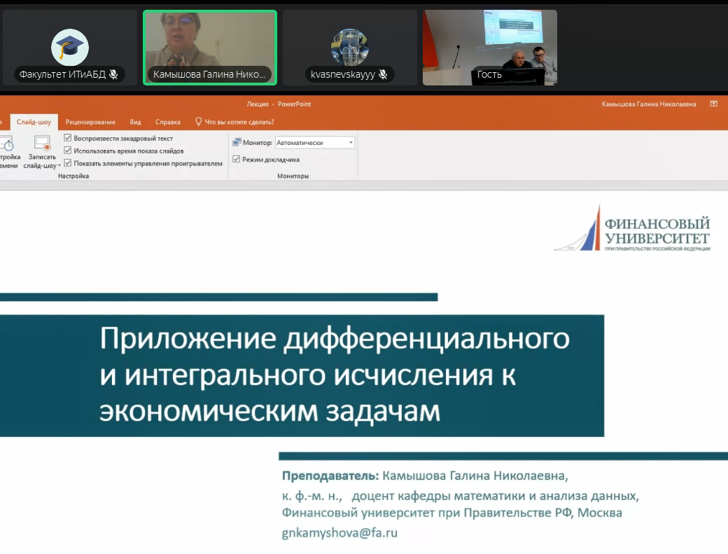 6 октября 2025 года доцент Кафедры математики и анализа данных Факультета информационных технологий и анализа больших данных Камышова Галина Николаевна провела онлайн-лекцию для студентов Академии управления при Президенте Республики Беларусь (г. Минск) в рамках Программы международной академической мобильности работников. Тема лекции — «Применение дифференциального и интегрального исчисления в решении экономических задач».