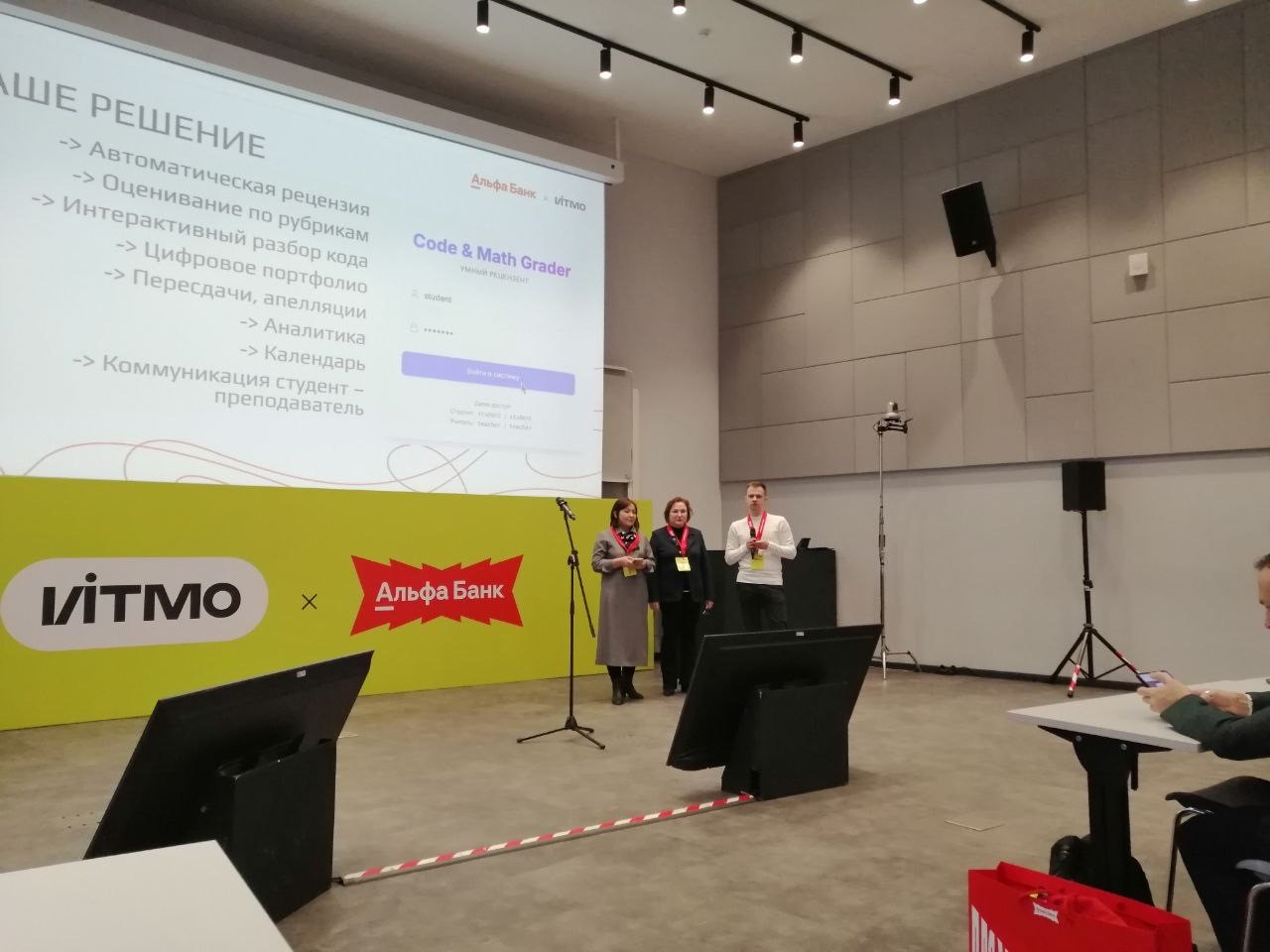 Доцент Мелехина Т.Л. участвовала в команде №1. Проект «Code & Math Grader. Умный рецензент» отмечен жюри как один из наиболее удачных. Директор мегафакультета трансляционных информационных технологий профессор Александр Бухановский, под руководством которого организована данная программа, отметил, что «данный курс заточен под тех, кто будет квалифицированными заказчиками систем и технологий ИИ от образования».