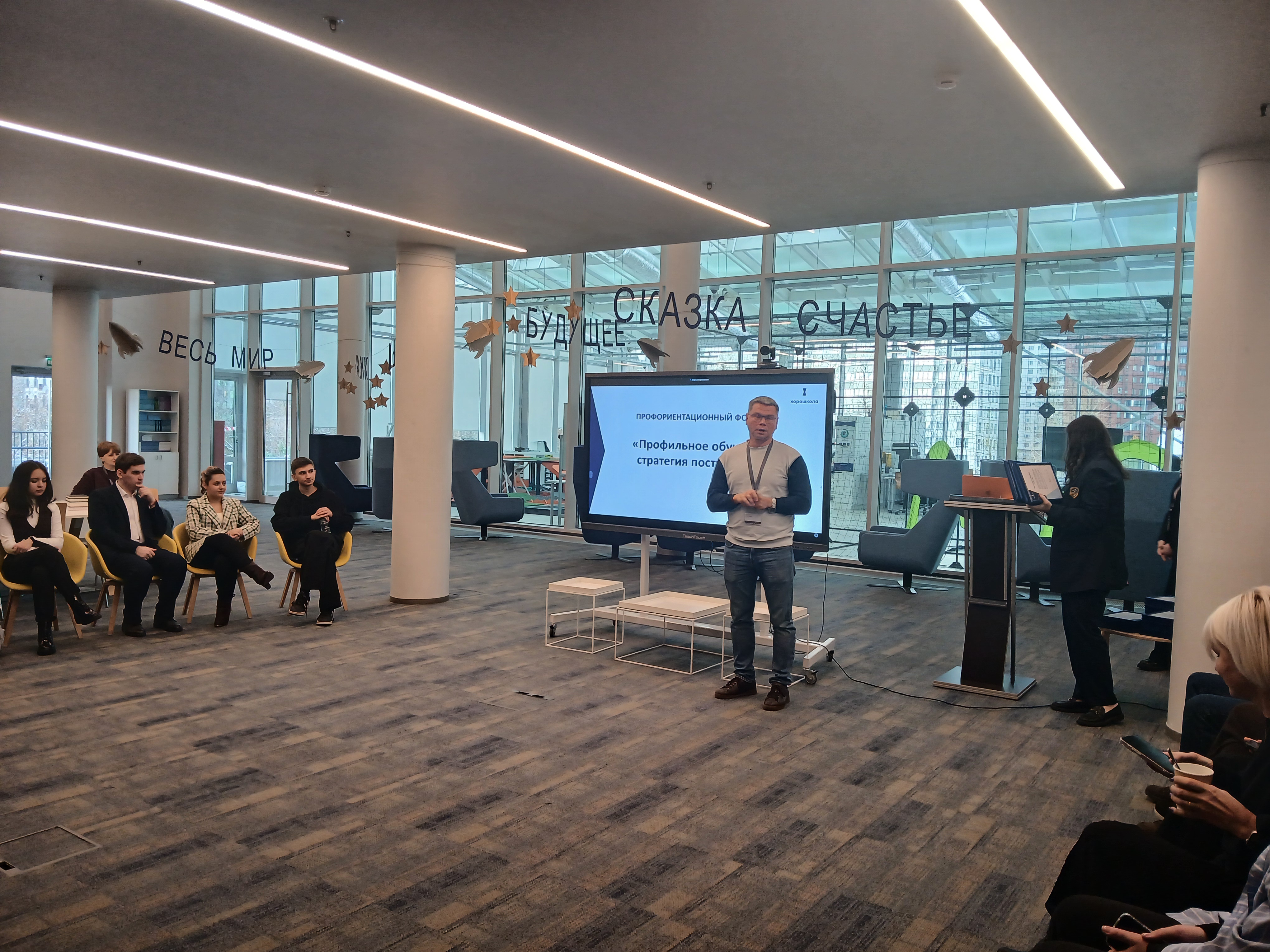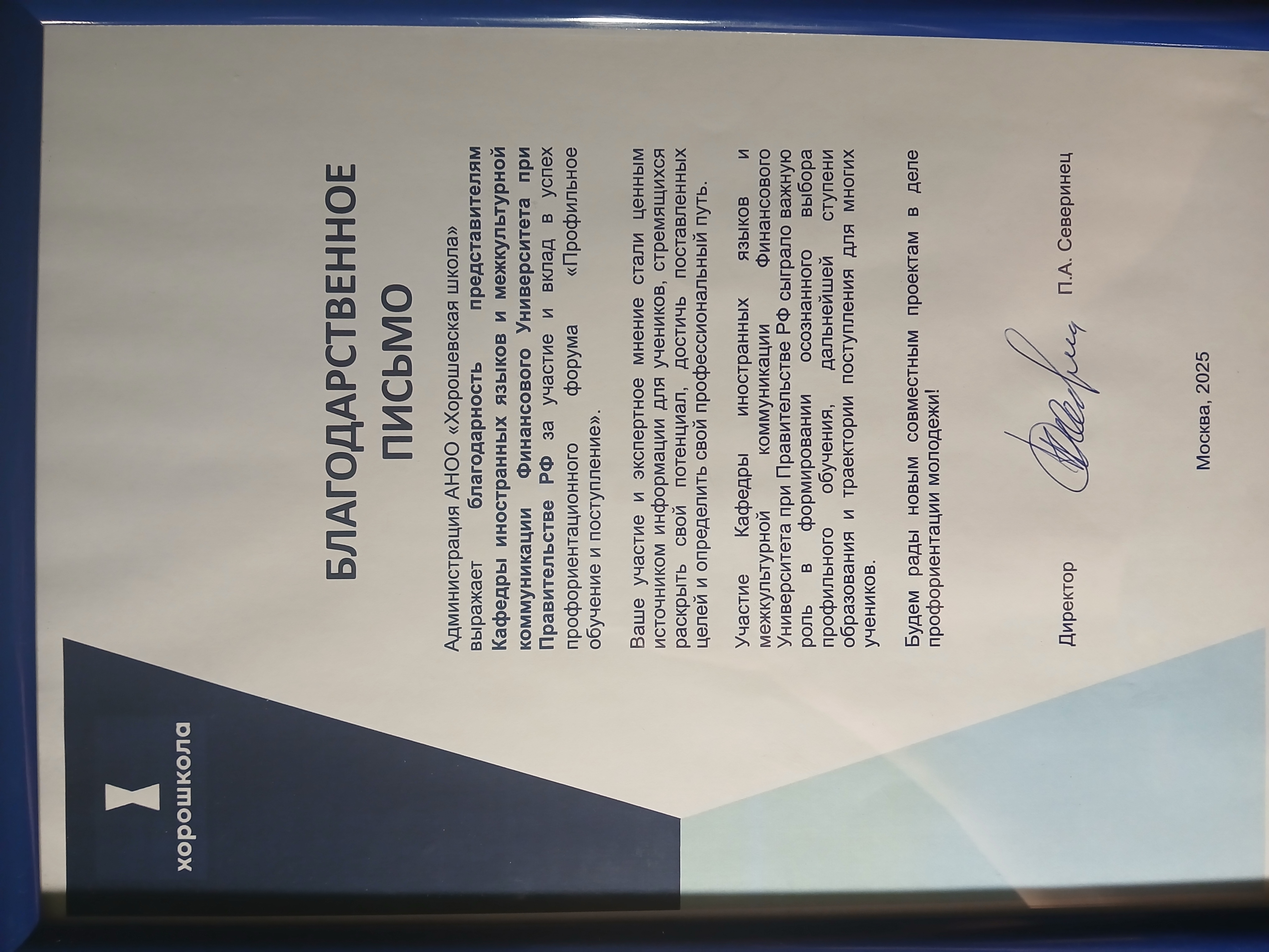 15 ноября 2025 года в Хорошевской школе «Хорошкола» состоялся профориентационный форум «Профильное обучение и поступление». В форуме приняли участие представители разных факультетов и кафедр Финансового университета при Правительстве РФ. Кафедру иностранных языков и межкультурной коммуникации представляла преподаватель Невская Елена Олеговна.