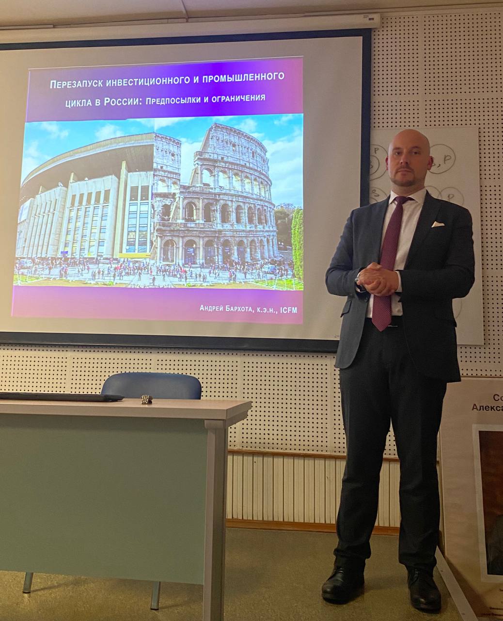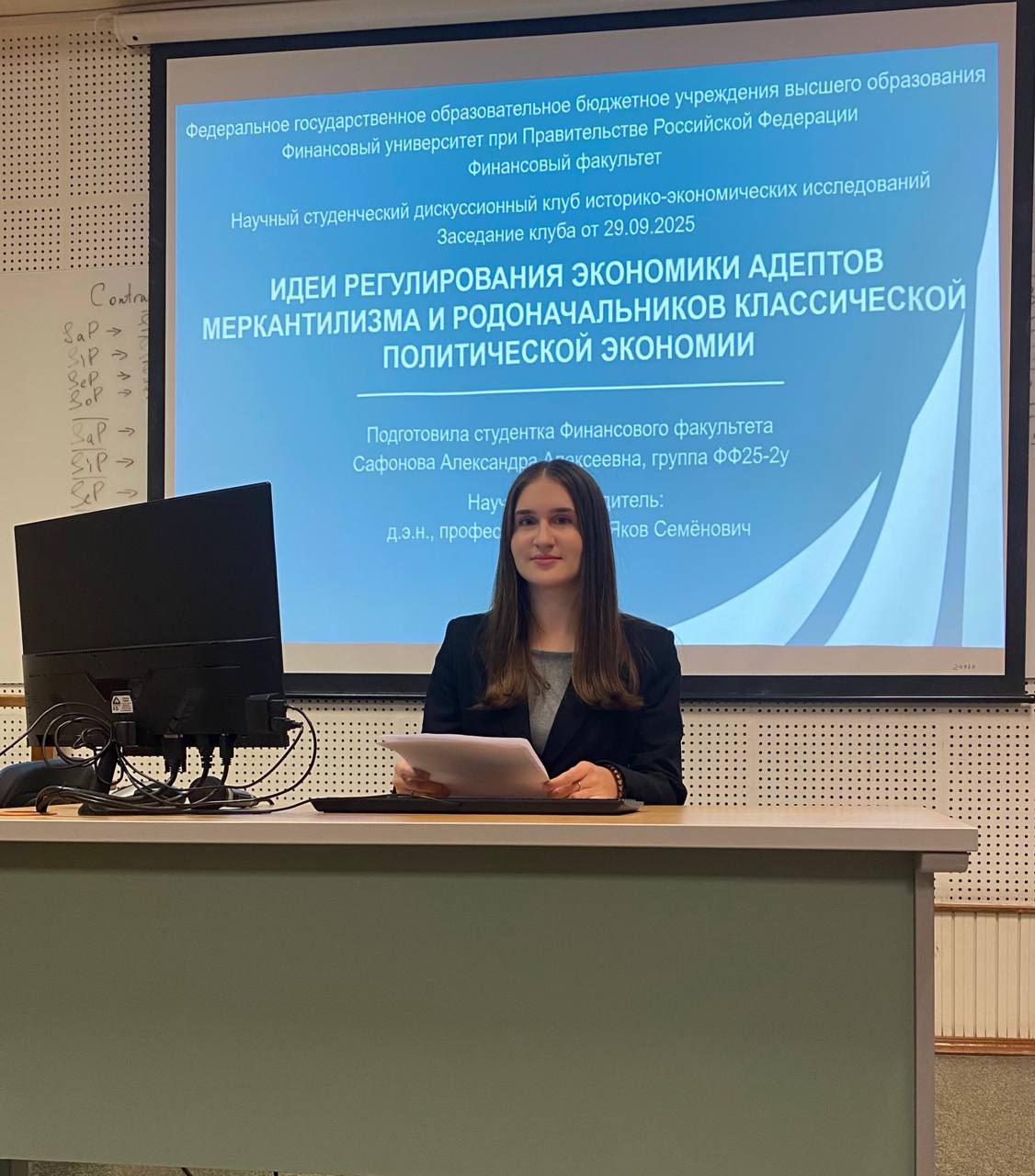 На заседании слушали научный доклад кандидата экономических наук, руководителя по специальным проектам ПСБ Андрея Валерьевича Бархоты на тему: «Перезапуск инвестиционного и промышленного цикла в России: предпосылки и ограничения»; доклад члена Клуба – студентки Меджлумян Софи Арменовны гр. МЭО24-9 на тему: «Идеи регулирования экономики в периоды древнего мира и средневековья»; доклад члена Клуба – студентки Сафоновой Александры Алексеевны гр. ФФ25-2у на тему: «Идеи регулирования экономики адептов меркантилизма и родоначальников классической политической экономии.