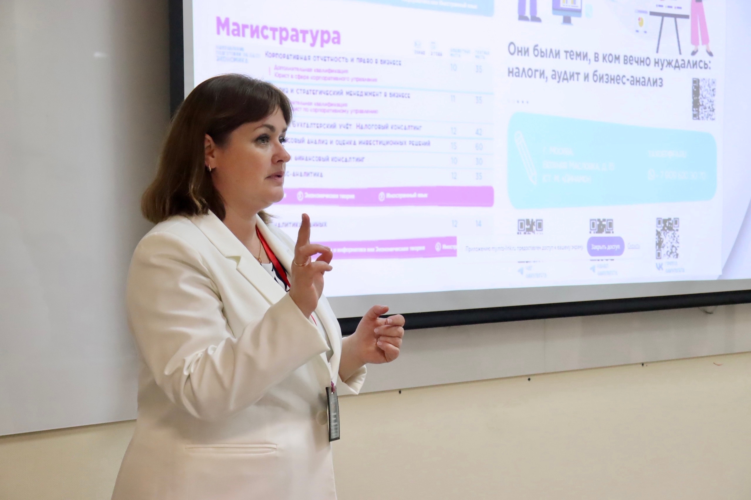 Помимо абитуриентов, мероприятие было предназначено и для тех, кто собирается продолжить образование в магистратуре. В своём выступлении заместитель декана по учебной и учебно-методической работе Мария Басова рассказала о преимуществах обучения в магистратуре факультета, высоком качестве образования и преподавателях-практиках, компаниях-партнерах и карьерных перспективах после окончания.