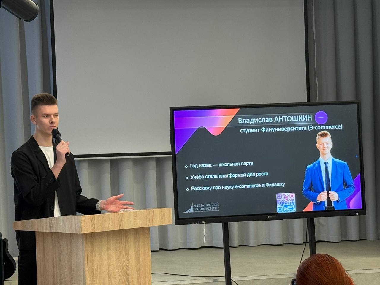 Владислав, студент направления подготовки «Электронная коммерция» Факультета НАБ, начал своё выступление с личной истории выбора вуза. Он подчеркнул, что Финансовый университет — это не только престижное образование, но и мощная экосистема для старта карьеры благодаря тесным связям с государственными структурами, банками и крупным бизнесом.