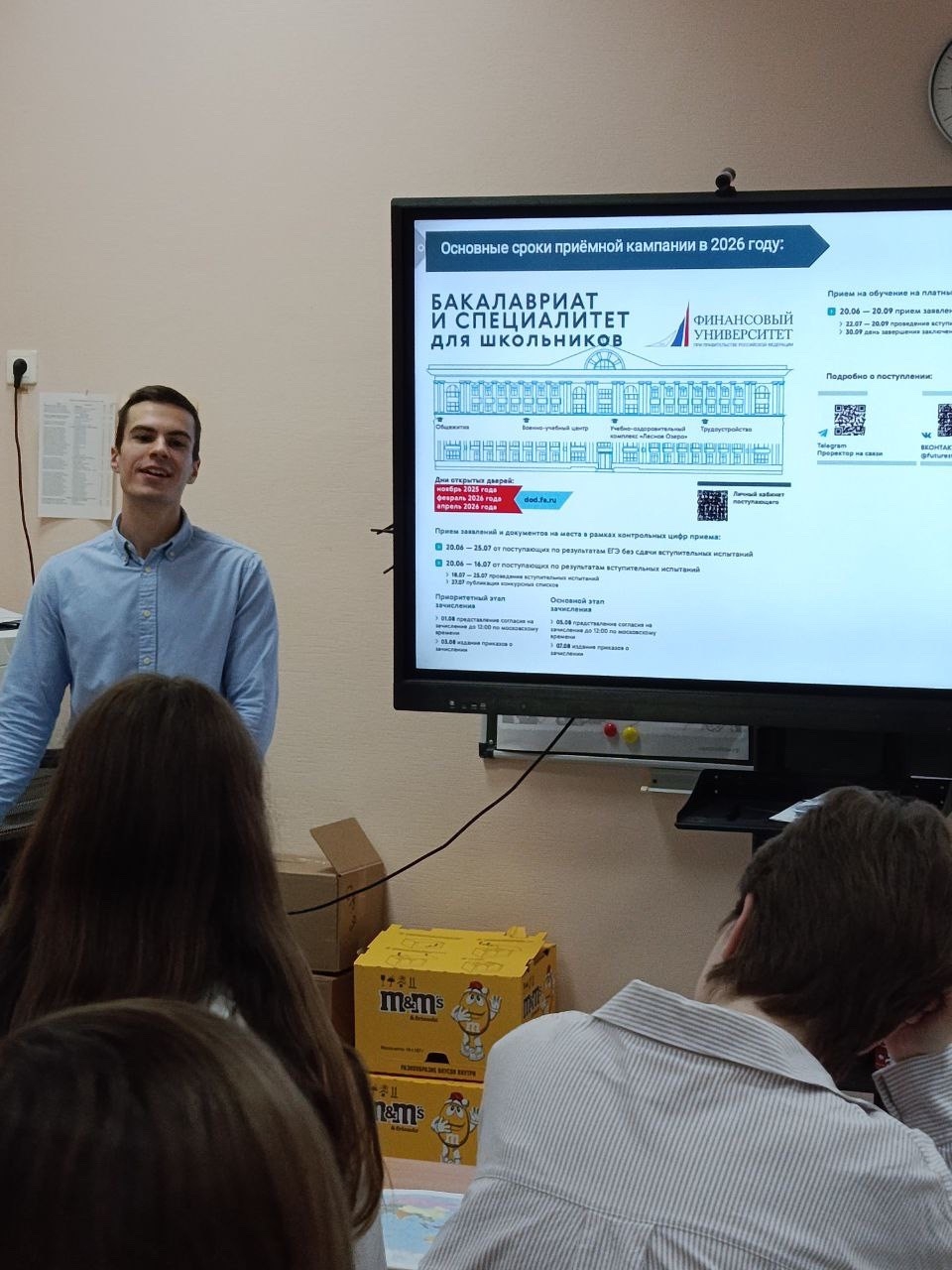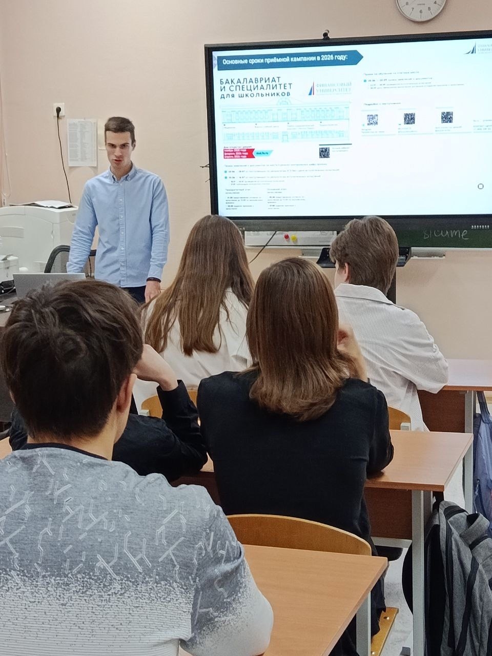 В ходе встречи школьникам были представлены направления подготовки на факультете СНиМК и в нашем университете в целом, проходные баллы на каждое направление. Григорий познакомил ребят с нашими кампусами, рассказал историю Университета.