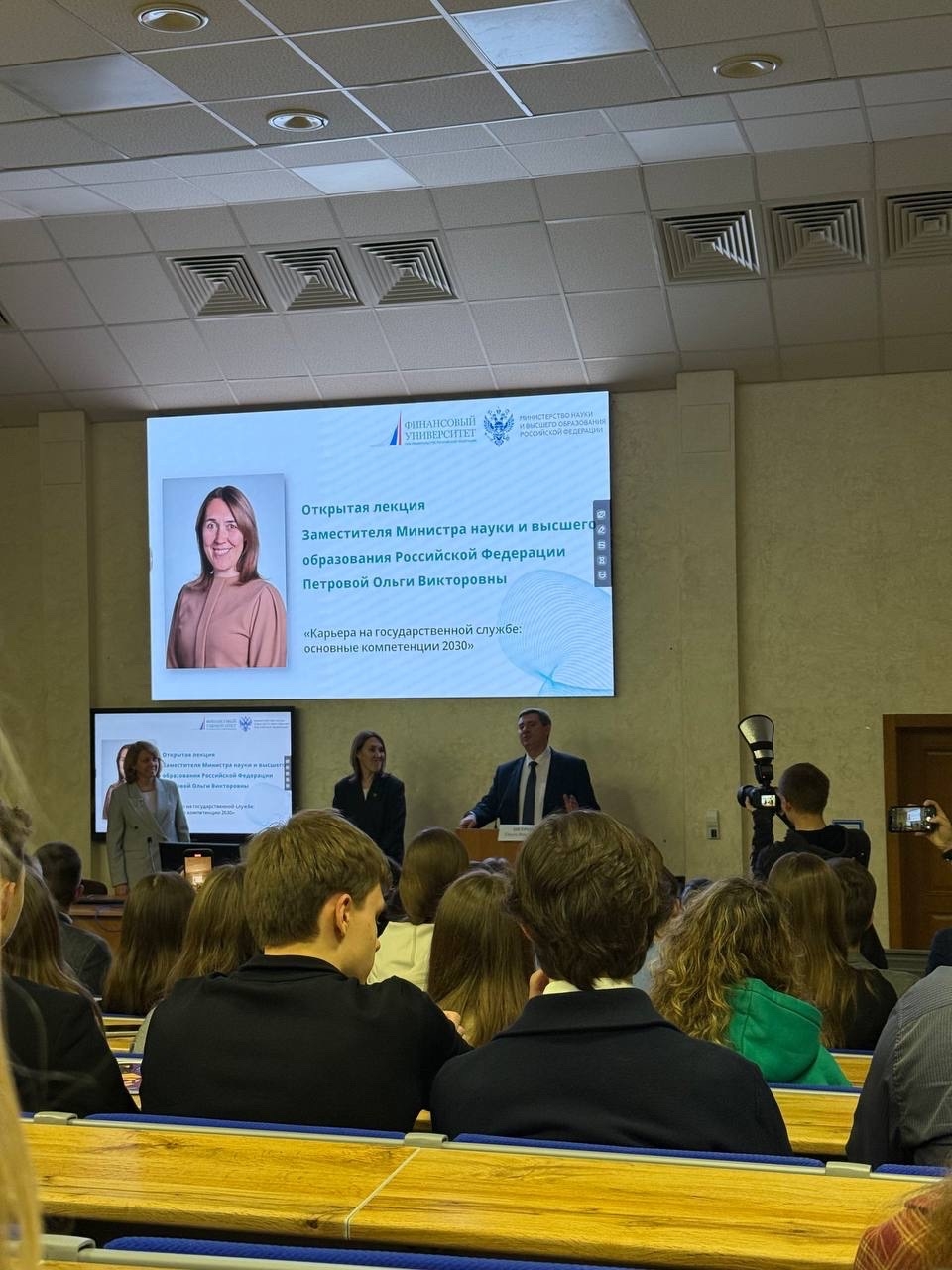 17 ноября 2025 года в Финансовом университете состоялась открытая лекция заместителя Министра науки и высшего образования Российской Федерации Ольги Викторовны Петровой. Тема выступления — «Карьера на государственной службе: основные компетенции – 2030» — привлекла студентов со всего университета, в числе которых были и представители Факультета социальных наук и массовых коммуникаций (группа РСО24-4).