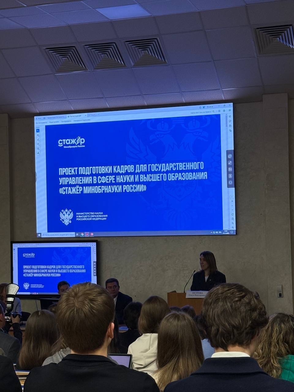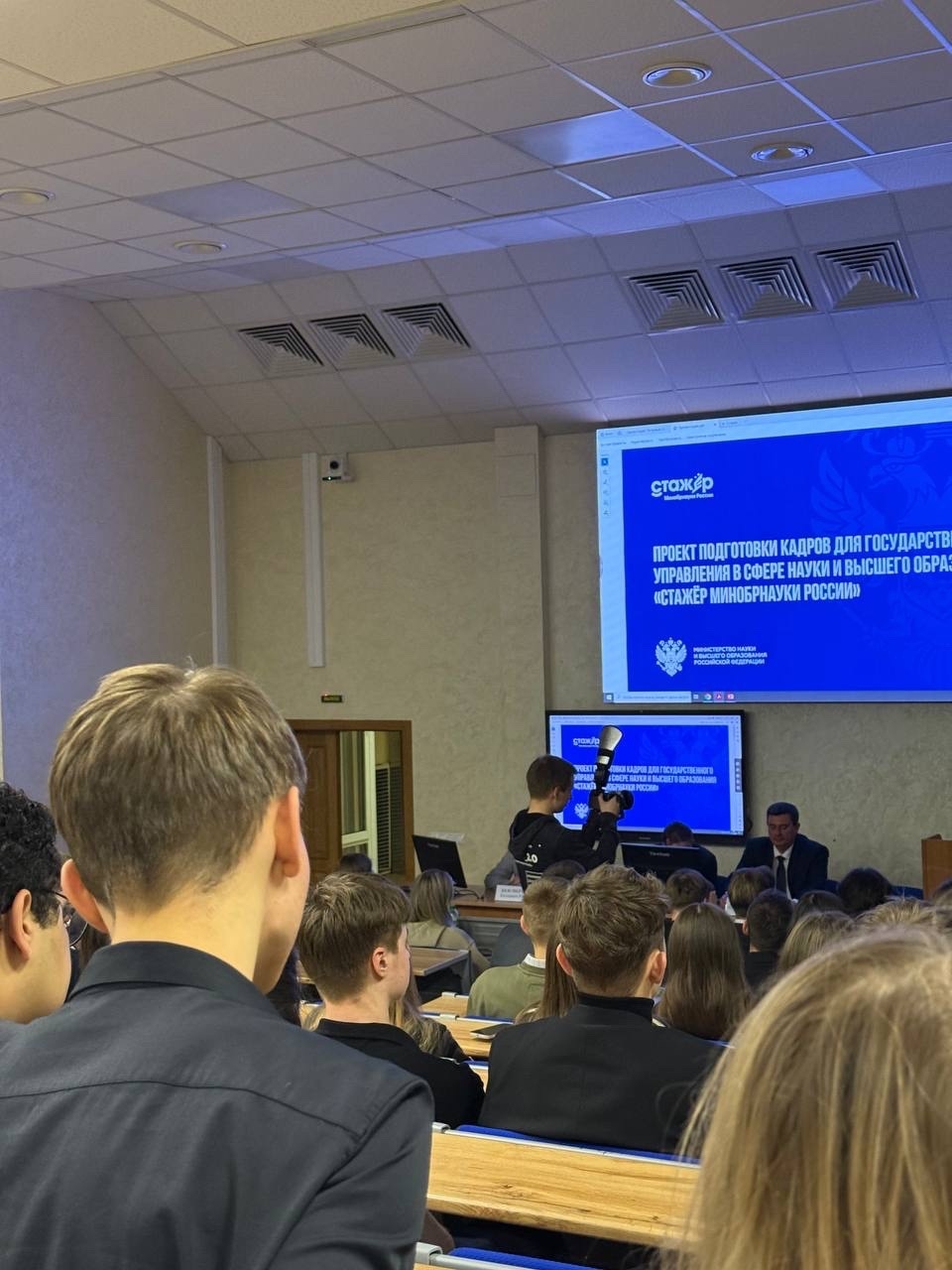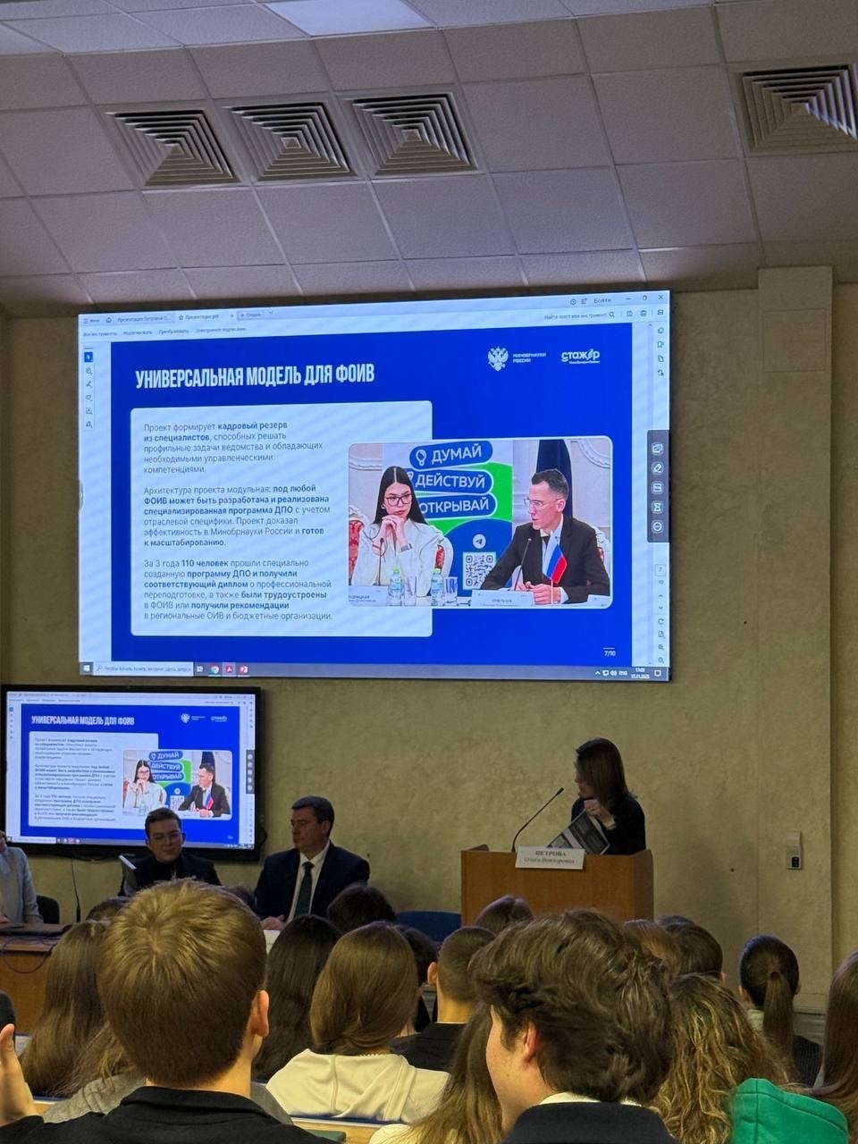 Значительную часть своей лекции Ольга Викторовна посвятила детальному рассказу о востребованном среди молодежи проекте «Стажер Минобрнауки России». Она объяснила его ключевую роль в формировании кадрового резерва и привела конкретные примеры задач, которые решают стажеры, погружаясь в работу Министерства.