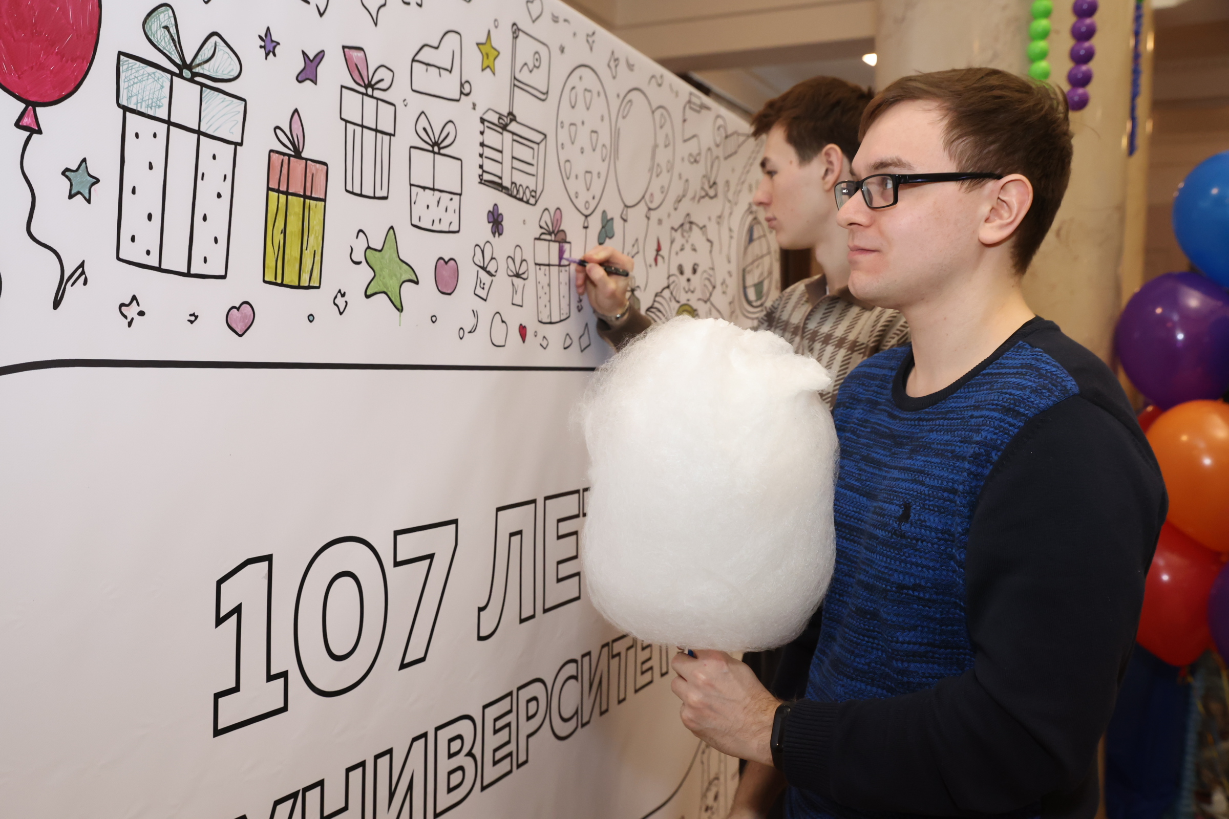 Особый интерес вызвала интерактивная зона: каждый желающий мог оставить свой след, раскрашивая яркий тематический стенд. Студенты охотно фотографировались на камеру моментальной печати и заполняли памятный альбом искренними пожеланиями в адрес родного вуза.