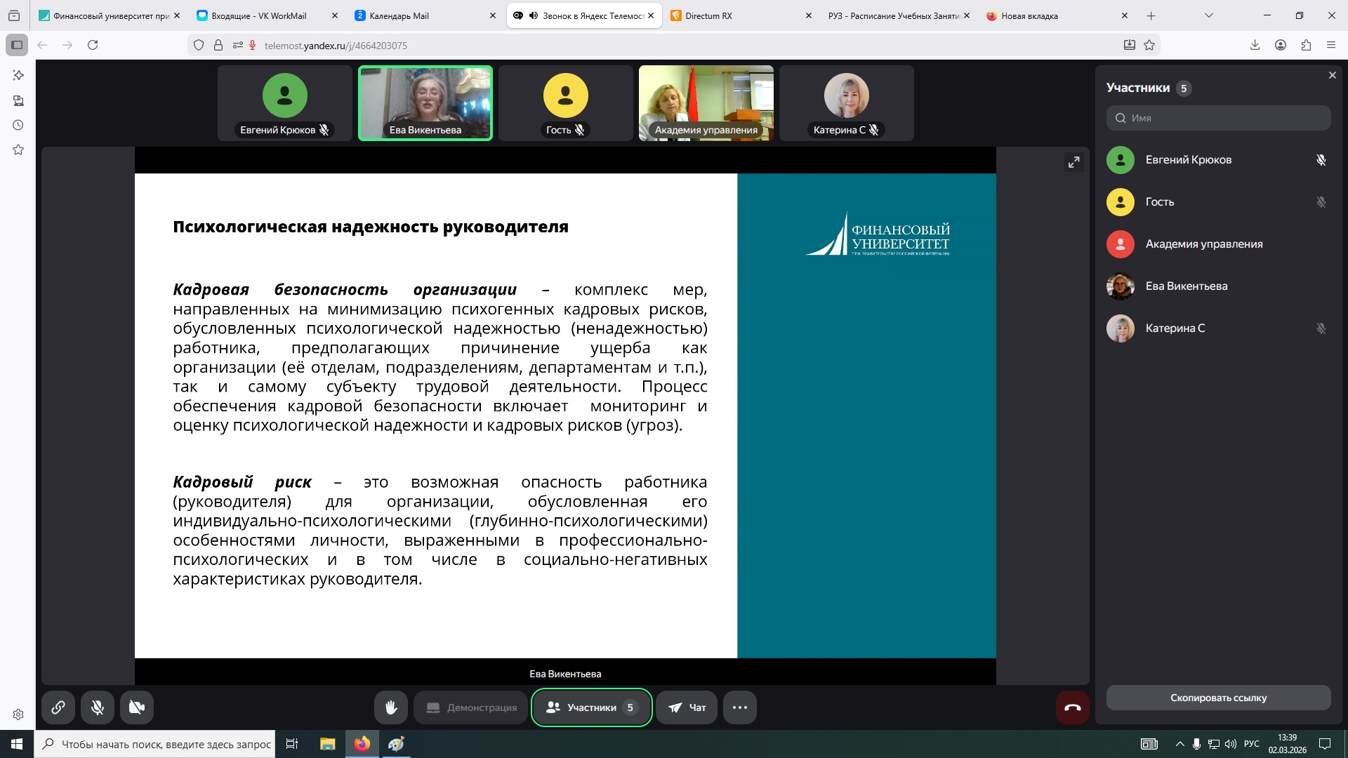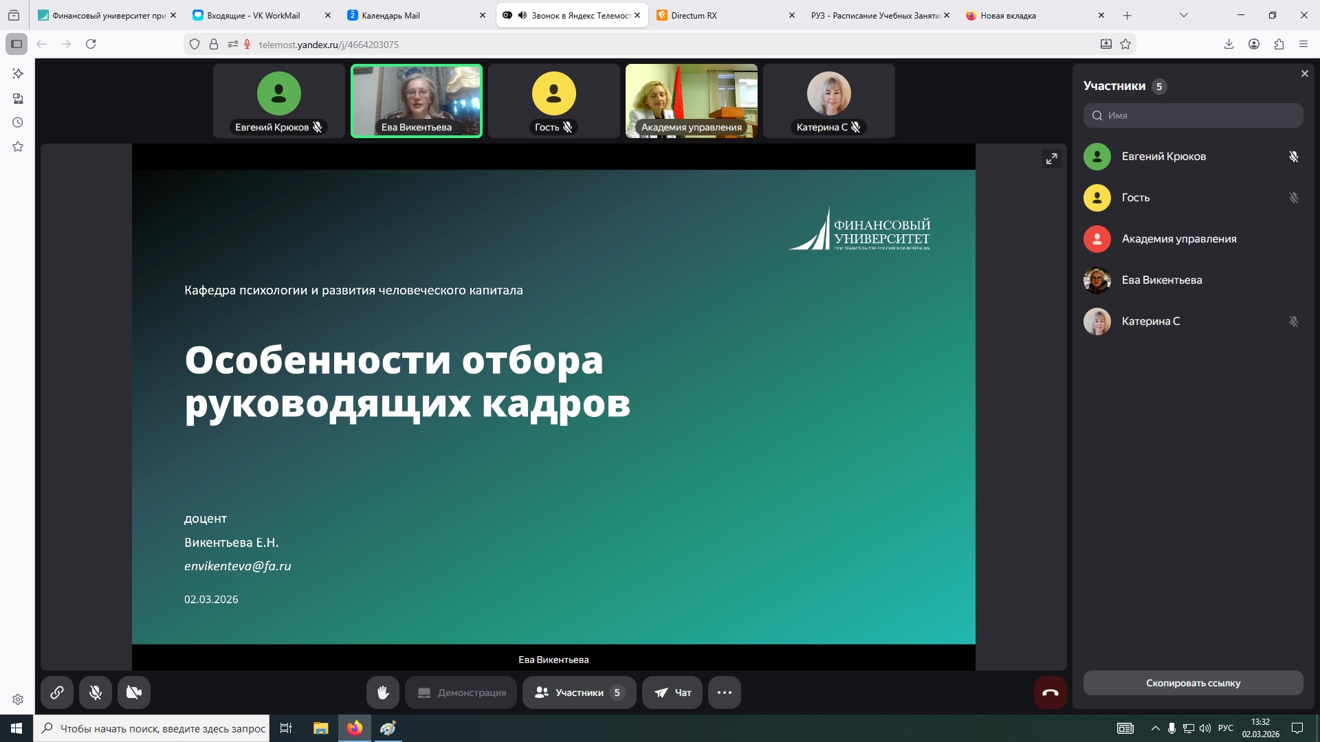 2 марта 2026 г. Е.Н. Викентьева прочитала слушателям Института государственной службы, обучающимся по специальности переподготовки «Управление персоналом» лекцию на тему «Особенности отбора руководящих кадров».