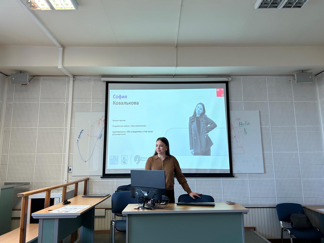 Спикер рассказала о прежнем опыте работы в ГБУ «МосТрансПроект» на должности «Тим-лид команды адаптации персонала», где разработала и внедрила проекта «Адаптация персонала в ГБУ «МосТрансПроект». Ковалькова София рассказала о нынешней работе в компании МТС, в которой, являясь бизнес-тренером, адаптировала более 500 сотрудников, в том числе руководителей, разработала проект «Наставничество», а также поделилась опытом работы в системе корпоративного обучения и пригласила студентов на стажировки в компании МТС.