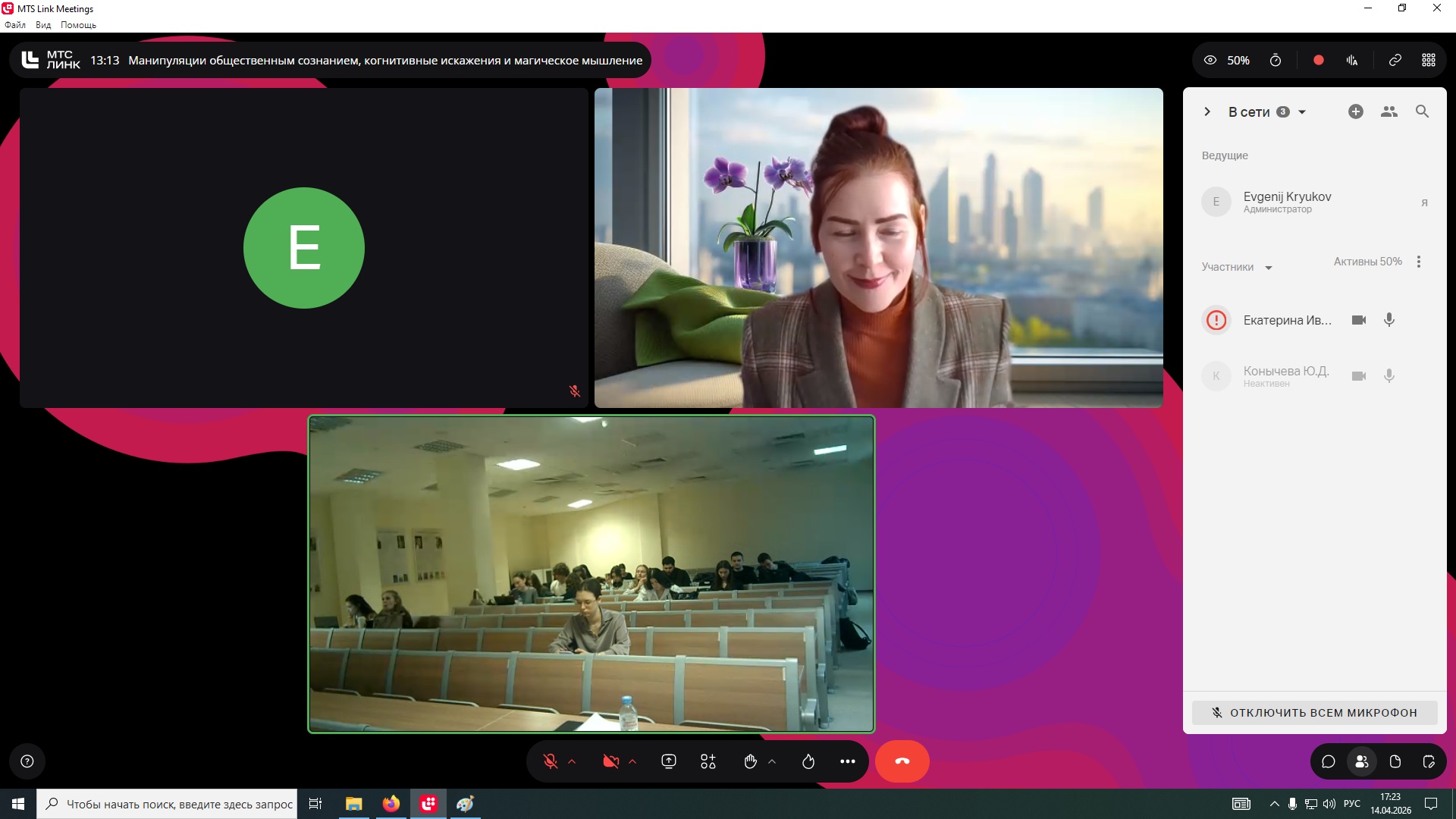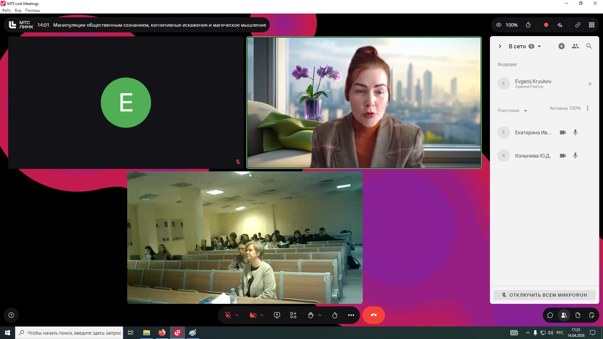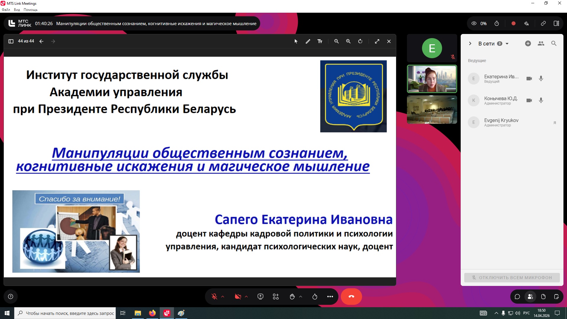 14 апреля 2026 г. Екатерина Ивановна прочитала лекцию на тему «Манипуляции общественным сознанием, когнитивные искажения и магическое мышление» для студентов 3 курса бакалавриата Факультета социальных наук и массовых коммуникаций очной формы обучения по направлению подготовки «Реклама и связи с общественностью».