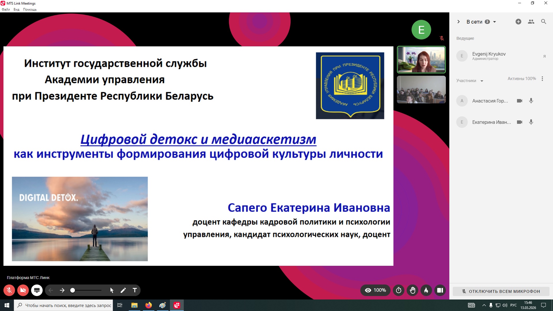 В рамках реализации программы «Приглашенный профессор» 13 марта 2026 г. Екатериной Ивановной Сапего, доцентом кафедры кадровой политики и психологии управления Института государственной службы Академии управления при Президенте Республики Беларусь была проведена лекция на тему «Цифровой детокс и медиааскетизм как инструменты формирования цифровой культуры личности» для студентов 3 курса бакалавриата Факультета социальных наук и массовых коммуникаций Финансового университета при Правительстве Российской Федерации очной формы обучения по направлению подготовки «Психология виртуальной среды и медиапространства».
