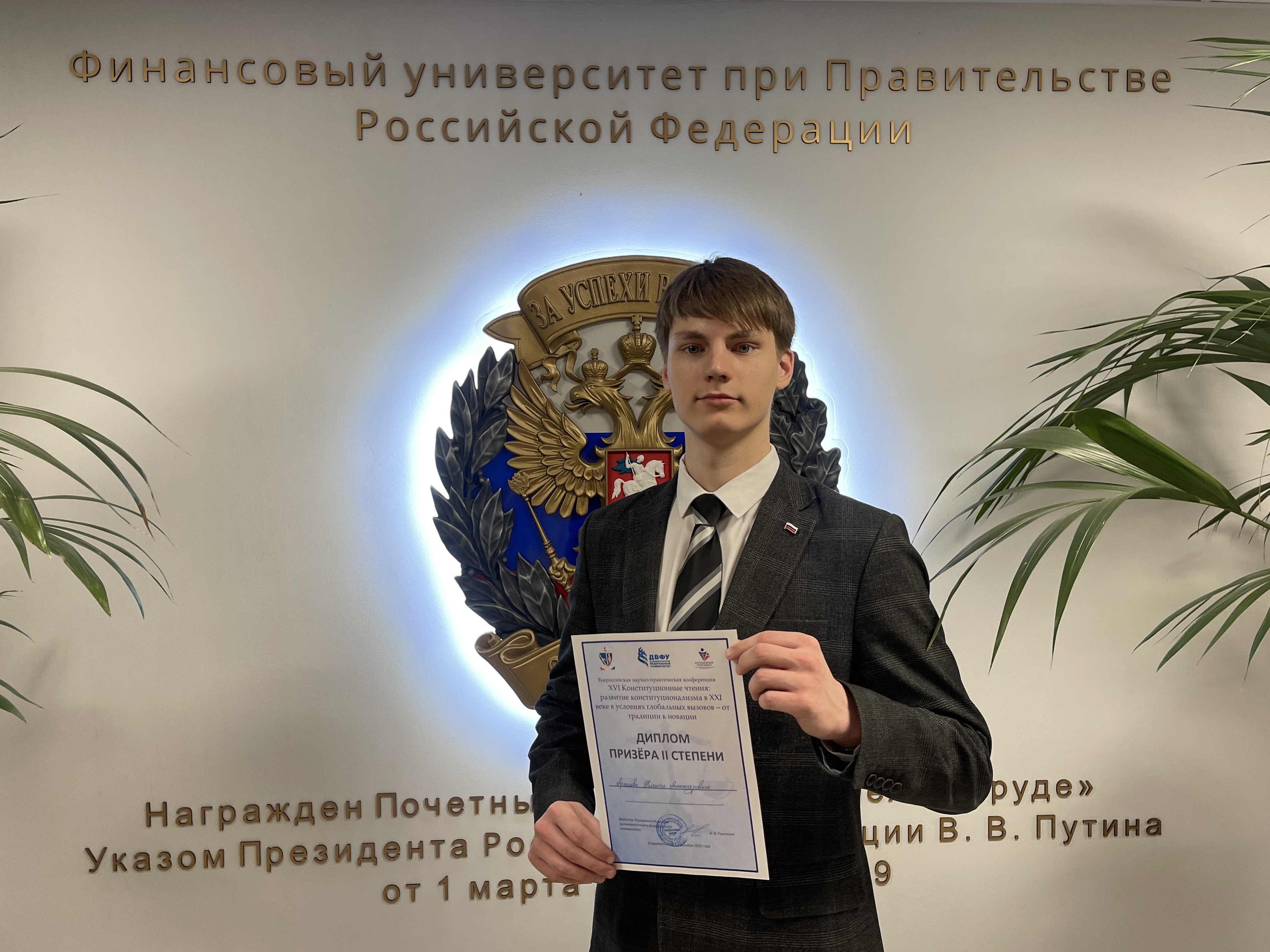 Студент группы Ю24-1 второго курса Юридического факультета Финансового университета Никита Арсеньев (научный руководитель – доцент кафедры международного и публичного права, кандидат юридических наук Ю.Е. Курилюк) 11 декабря стал серебряным призером Всероссийской научно-практической конференции «XVI Конституционные чтения: развитие конституционализма в XXI веке в условиях глобальных вызовов – от традиции к новации», проходившей в Дальневосточном федеральном университете. Не помешало блестящему результату даже то, что выступать в силу расстояний и напряженного учебного графика пришлось онлайн.