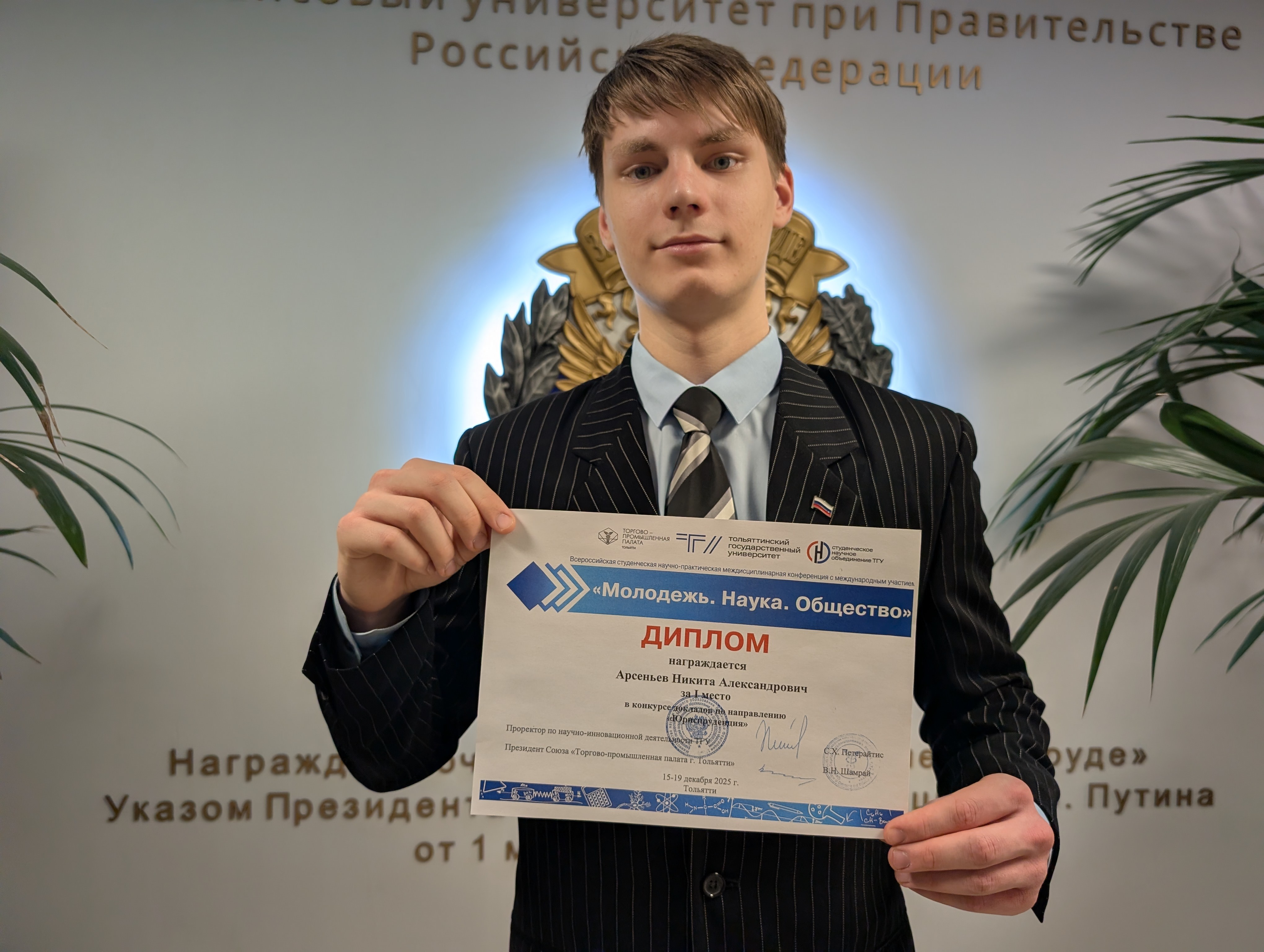 Однако Никиту второе место не устроило и 16 декабря он улучшил свой результат уже на конференции в Тольятинском государственном университете. По результатам Всероссийской студенческой научно-практической междисциплинарной конференции с международным участием «МОЛОДЁЖЬ. НАУКА. ОБЩЕСТВО» обучающийся Финуниверситета был награждал дипломом за 1 место в конкурсе докладов по направлению «Юриспруденция»!