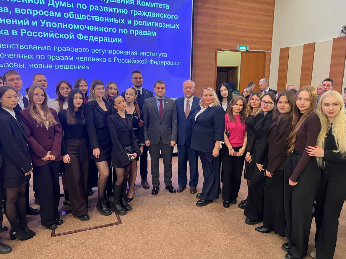 10 ноября 2025 года в Малом зале Государственной Думы Федерального Собрания Российской Федерации состоялись парламентские слушания на тему «Совершенствование правового регулирования института уполномоченных по правам человека Российской Федерации: новые вызовы, новые решения». В мероприятии приняли участие студенты Финансового университета при Правительстве Российской Федерации со своими наставниками М.Ф. Гацко и О.В. Поповой, доцентами кафедры Международного и публичного права юридического факультета.