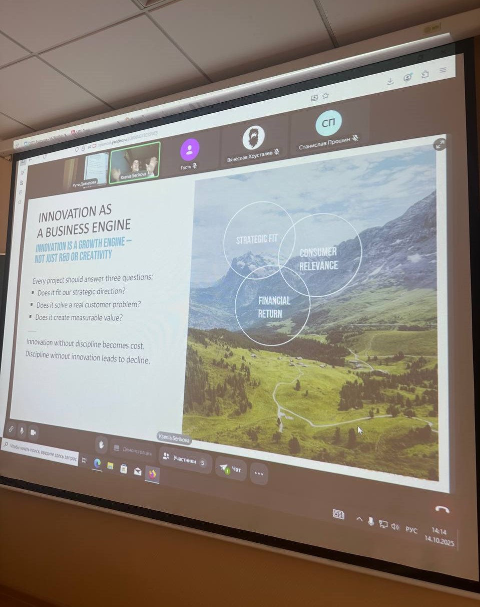 14 октября 2025 года студенты Факультета "Высшая школа управления" в рамках дисциплины «Управление эффективностью бизнеса» приняли участие в мастер-классе «От идеи к результату - как инновации стимулируют финансовый рост в фармацевтическом производстве», который провёл глобальный лидер инновационного отдела, Reckitt (бренд Nurofen) Ксения Олеговна Серикова.