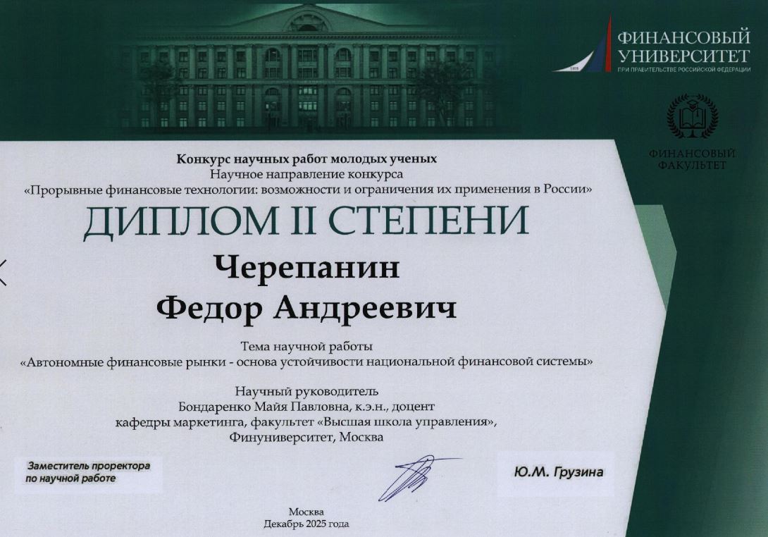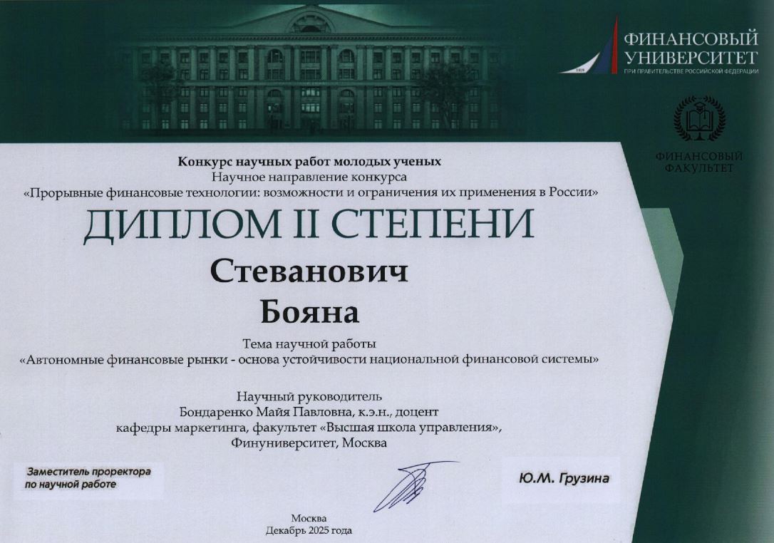 В напряженной борьбе второе место в направлении «Прорывные финансовые технологии» заняли студенты 4 курса кафедры маркетинга Финуниверситета группы МК 22-5 Бояна Стеванович и Федор Черепанин. Несмотря на то, что ребята обучаются по направлению «Маркетинг», они блестяще проявили себя в сложной области финансового анализа. Тема их исследования — «Автономные финансовые рынки — основа устойчивости национальной финансовой системы» — отражает глубокий интерес к современным технологическим трендам и их системному анализу.