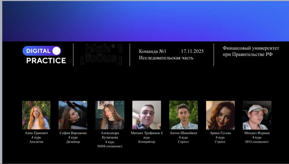 Команда талантливых студентов Кафедры маркетинга: Гракович Анна, Варлакова София, Гусева Арина, Кузнецова Александра, Трофимов Михаил, Шипейкин Антон, Фурман Михаил (гр МК 22-3) успешно преодолела конкурсный отбор и вышла в финал престижного Международного межвузовского конкурса DIGITAL PRАКТИКА.