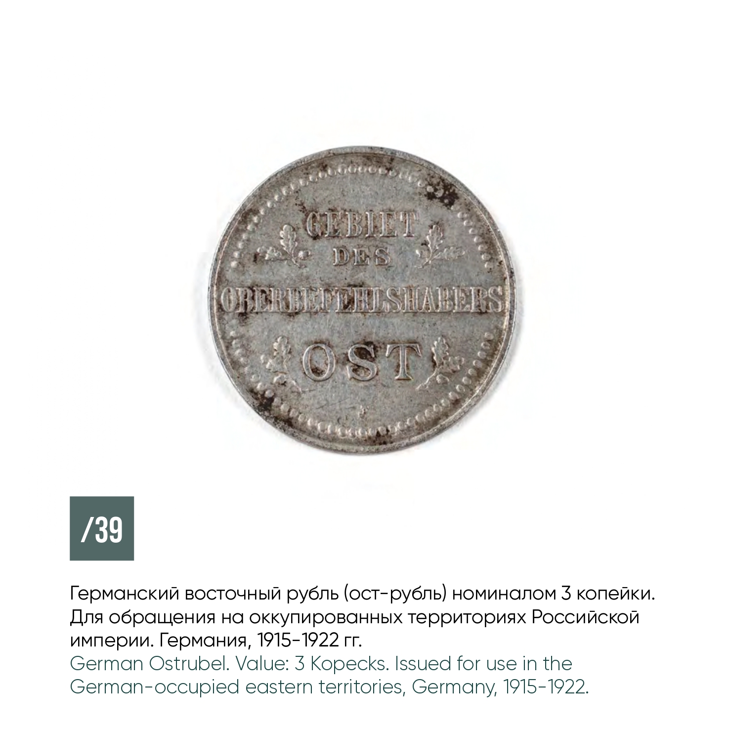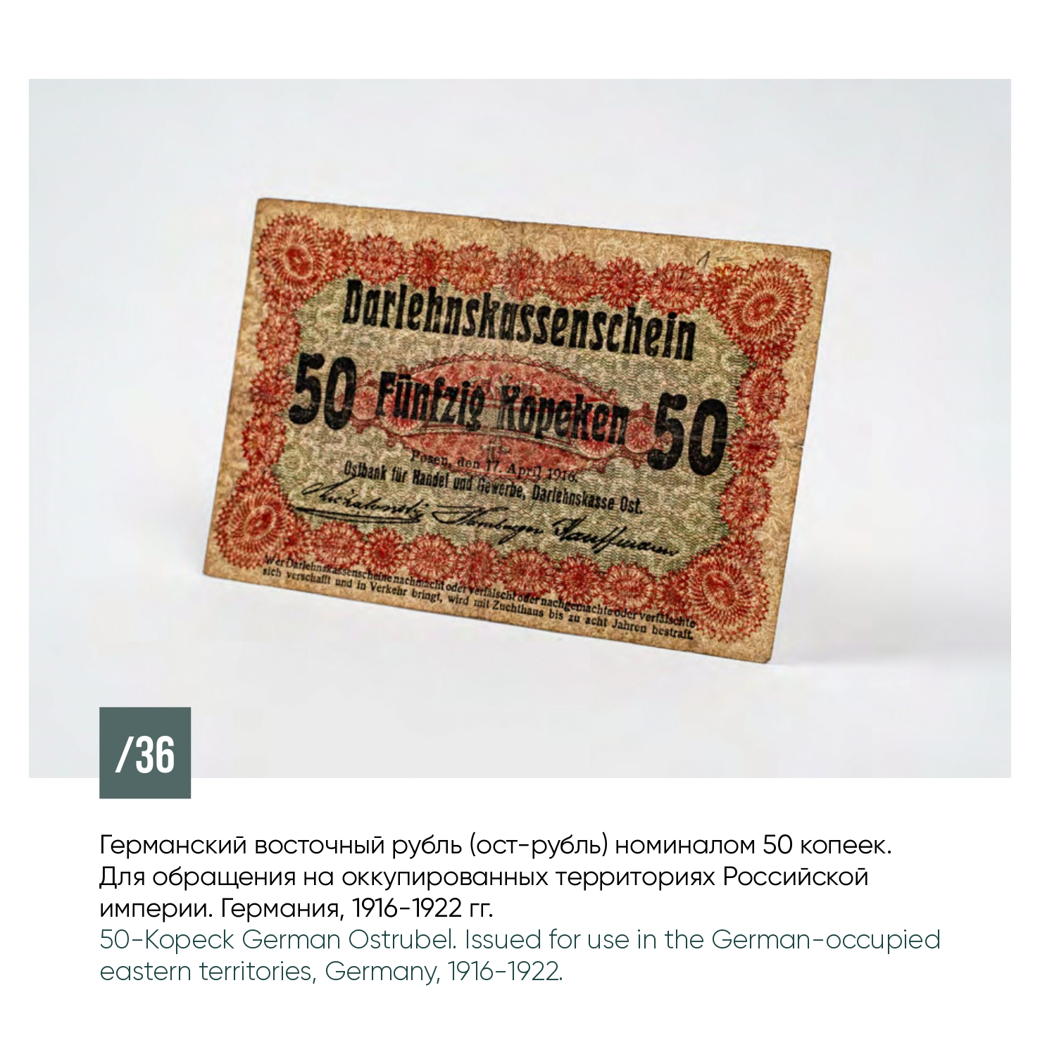 В экспозиции также представлены бумажные денежные знаки и монеты, выпускавшиеся Восточным банком Германской империи для использования на оккупированных территориях Российской империи в период Первой мировой войны, а также поддельные бумажные облигации периода Отечественной войны 1812 г.