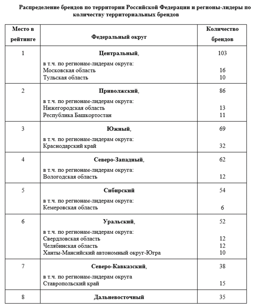 Согласно исследованиям, почти 500 существующих в настоящее время территориальных брендов, группируются следующим образом: межрегиональные (6 брендов), региональные (70 брендов), муниципальные и межмуниципальные (97 брендов) событийные (19 брендов), зарегистрированные (77 брендов) и 230 наименований мест происхождения товара.