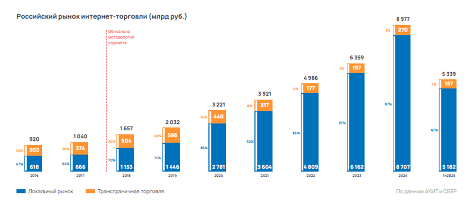 По данным Ассоциации компаний интернет-торговли (АКИТ) и Сбер, объем рынка Интернет-торговли в России в 2023 году превысил 6 трлн рублей.
