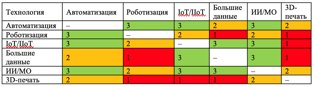 Итак, ключевые цифровые технологии в горнодобывающей промышленности тесно взаимосвязаны и дополняют друг друга. Таблица 1 отражает взаимовлияние технологий (табл. 1).