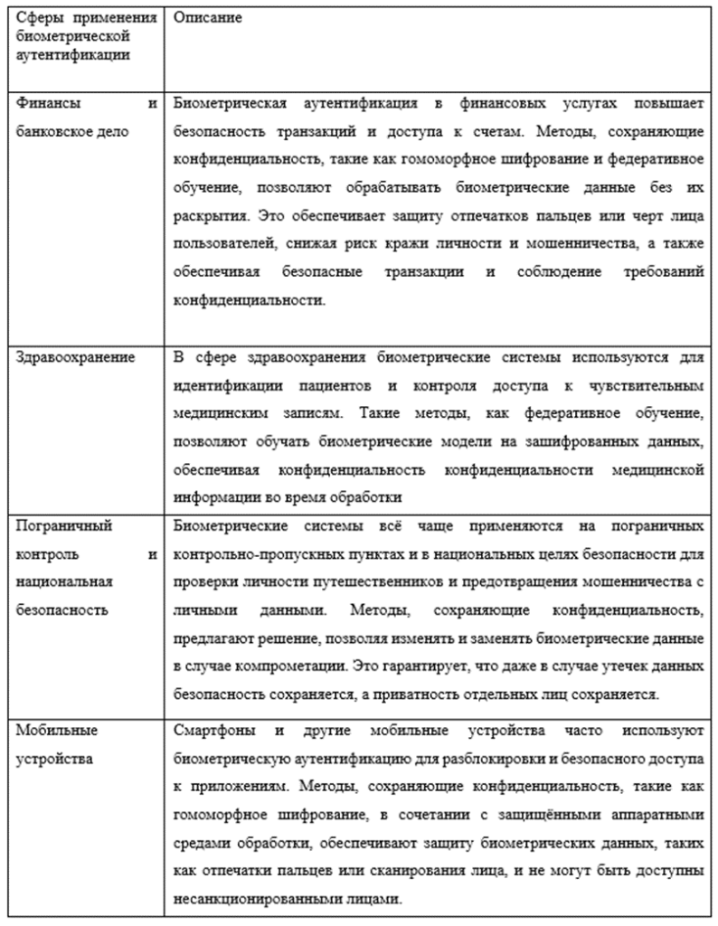 В настоящее время биометрическая аутентификация нашла свое применение в ряде сферах, некоторые из которых отображены в представленной ниже таблице.
