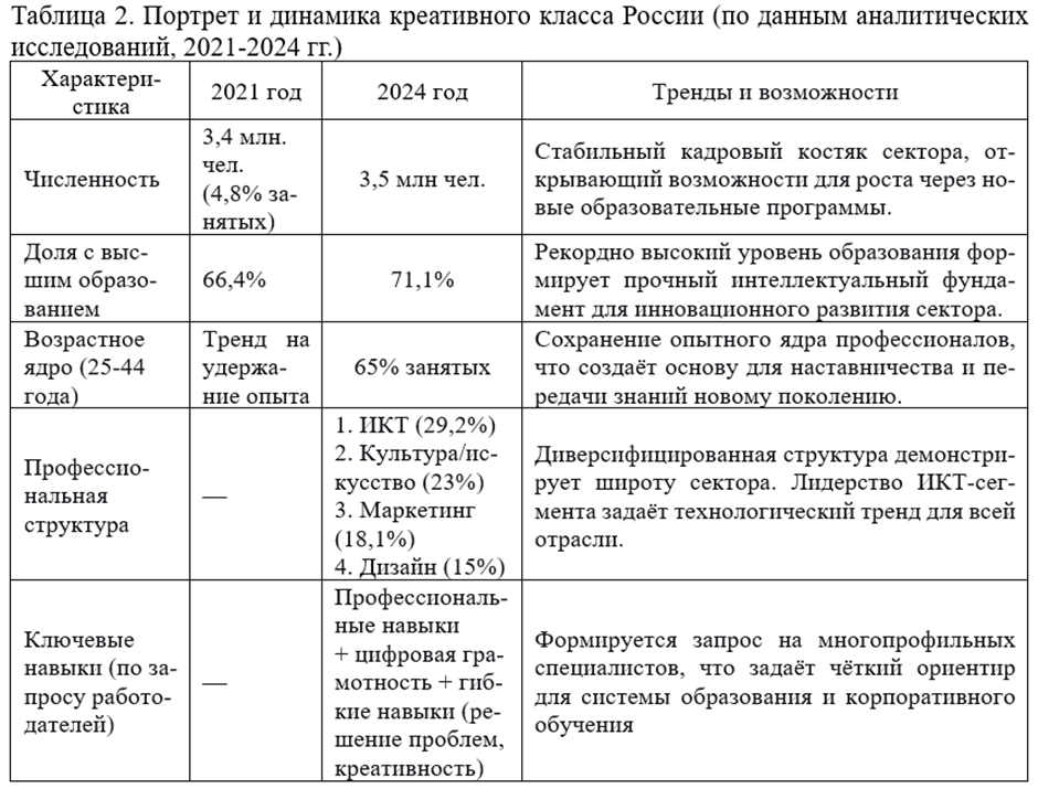 Специалисты креативного сектора представляют собой высокообразованное и цифровое ядро современной экономики, чей потенциал продолжает расти (таблица 2).