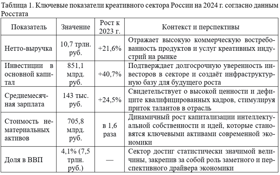 Как отмечает доцент Кафедры общего и проектного менеджмента Факультета «Высшая школа управления» Финансового университета при Правительстве РФ, кандидат экономических наук Мухаррамова Эльмира Рафаиловна, российская экономика уверенно вступает в новую стадию развития, где ключевым фактором роста становятся интеллектуальные ресурсы, креативность и способность к инновациям. Ярким свидетельством этого перехода служит динамичный сектор креативных индустрий, доля которого в ВВП страны превысила 4%. Этот сектор превратился в значимую точку экономического роста, важный социальный лифт и площадку для формирования востребованных компетенций.
