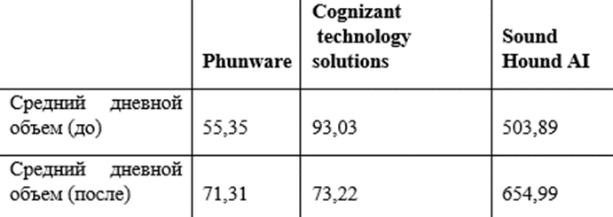 Таблица 3 – Средний дневной объем торгов (тыс. лотов) рассматриваемых акций до и после внедрения решений в сфере генеративного ИИ