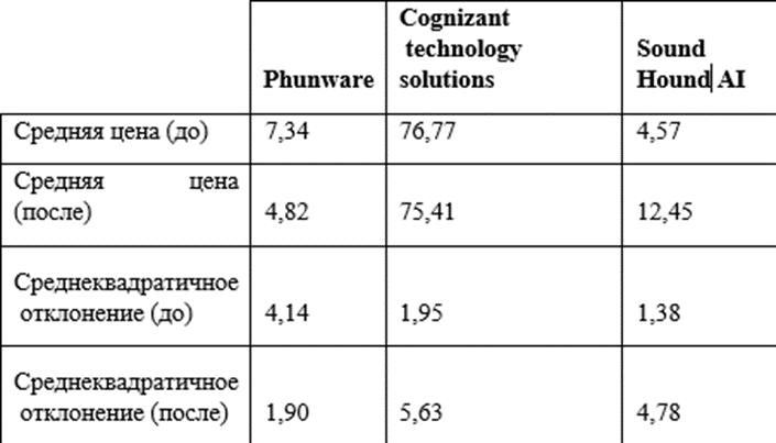 Таблица 2 – Динамика средней цены и среднеквадратического отклонения рассматриваемых акций до и после внедрения решений в сфере генеративного ИИ, долл. США