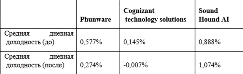 Таблица 1 – Средняя дневная доходность рассматриваемых акций до и после внедрения решений в сфере генеративного ИИ, %