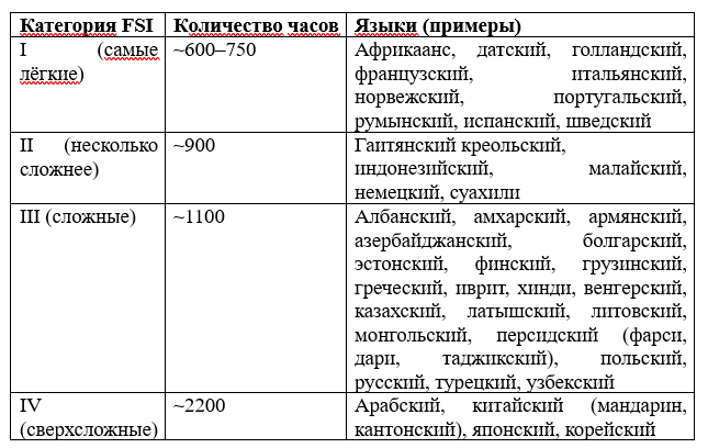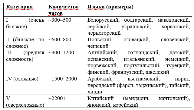 В России не существует официального аналога стандарту FSI, но методология также предполагает интенсивное погружение, коммуникативный подход и изучение культурных особенностей. Если мы попытаемся создать подобную таблицу для носителей русского языка, то принимая во внимание близость языков к одной семье, алфавит, грамматическую структуру, культурную и лексическую близость, получим следующую классификацию: